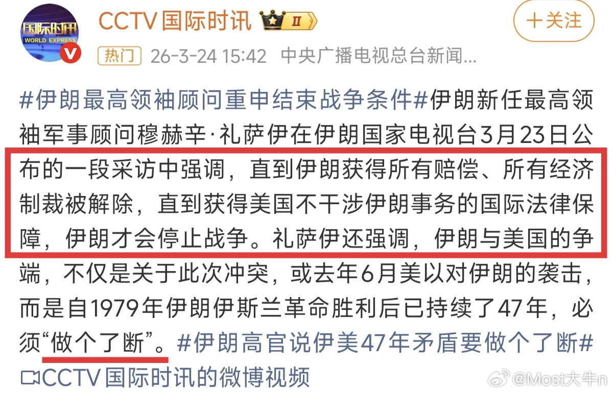 伊朗再次重申了停火条件!最高领袖军事顾问礼萨伊表示: