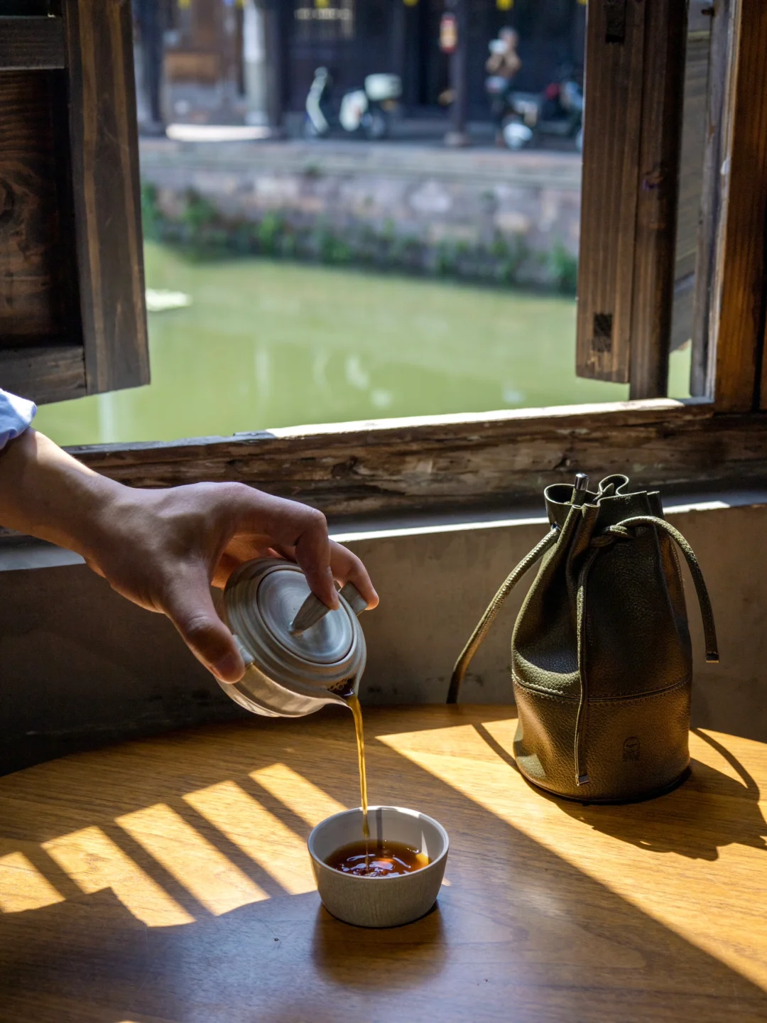 ❸古镇最热闹的茶馆集中在西河口历史文化街区,跟朋友找一家临河茶楼,像本地人一样喝茶聊天,甚是悠哉。这次我带了春竹快客杯,自带小拎包携带方便,一壶两杯,小巧精致的国风设计,给我们的古镇一行增添不少江南趣味。