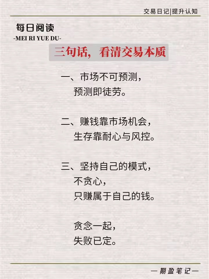 交易日记|提升认知。每日阅读。三句话看清交易本质。·一、市场不可预测,预测即徒劳。·二、赚钱靠市场机会,生存靠耐心与风控。·三、坚持自己的模式,不贪心,只赚属于自己的钱。贪念一起,失败已定。一期盈笔记。