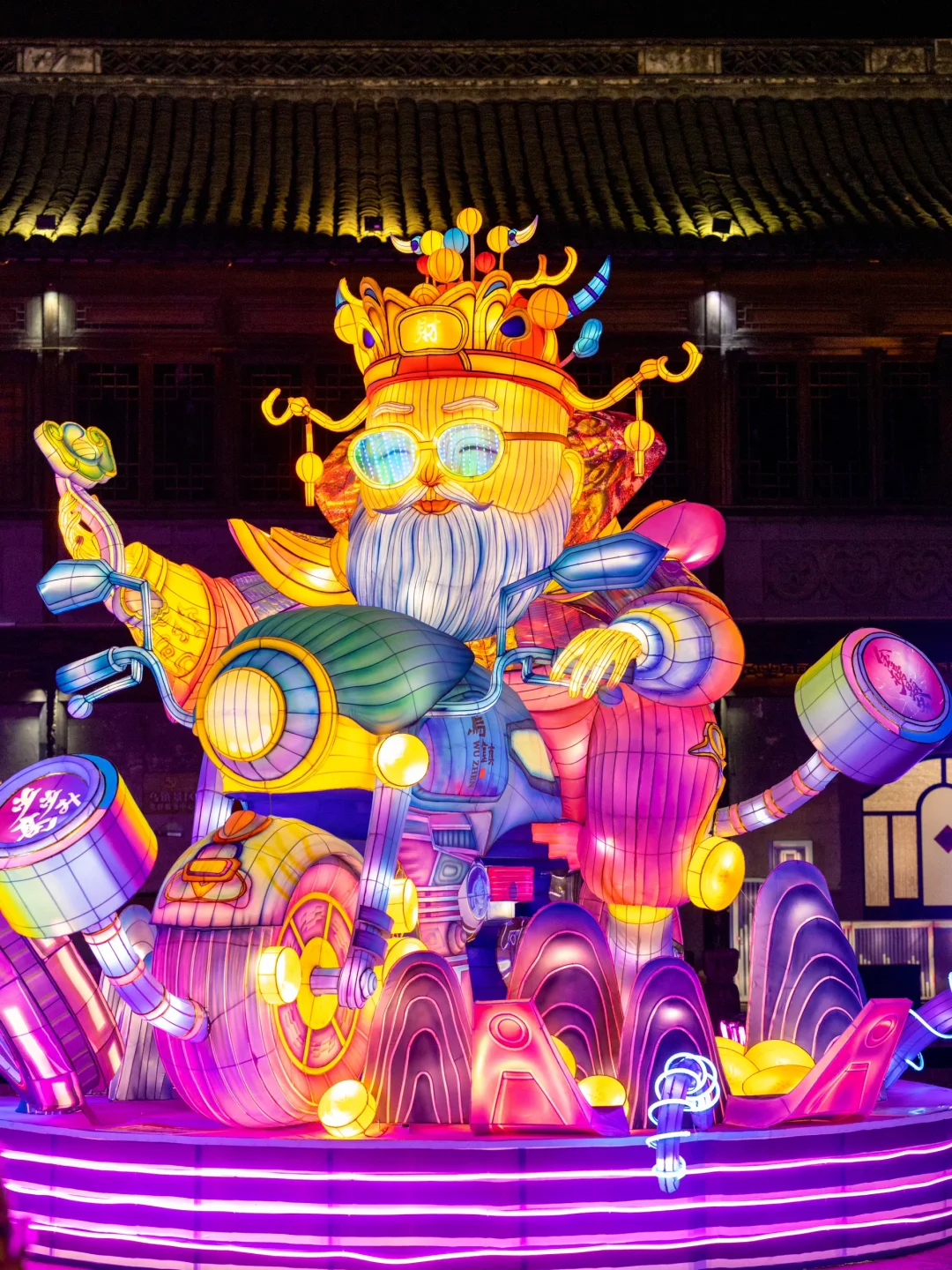赛博朋克风格的集市,可以看春晚同款机器人拜年表演,还有机械臂冰淇淋和咖啡!巨型的赛博朋克财神爷花灯就在这里。