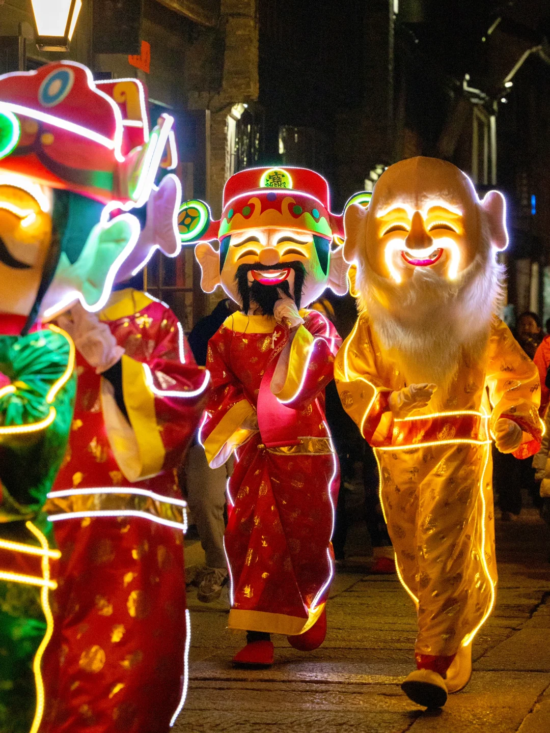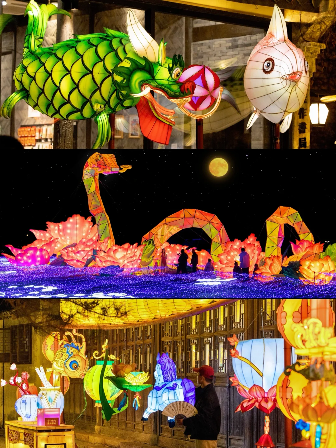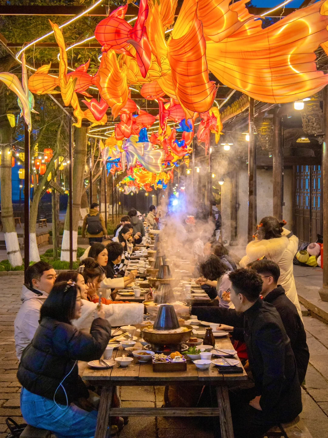 晚上来这里跟家人一起吃长街宴,坐在锦鲤花灯下,烟火气十足~最后不要忘了跟码头的莲鲤知趣花灯合影噢