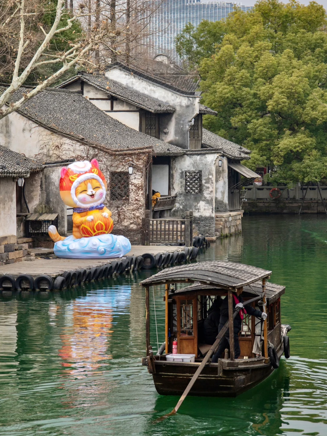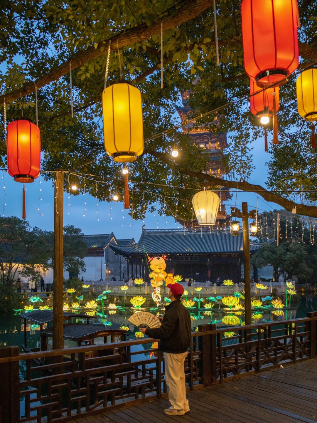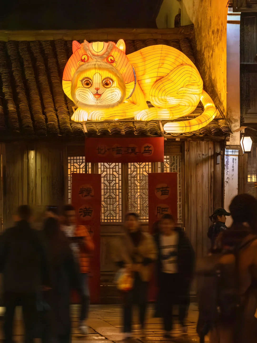 年味十足的水乡年食集,可以体验各种非遗活动,剪纸,打年糕,吹糖人,写春联,还有超出片的锦鲤花灯栈道~超级可爱的屋顶橘猫花灯就在附近的裕生餐馆旁边。
