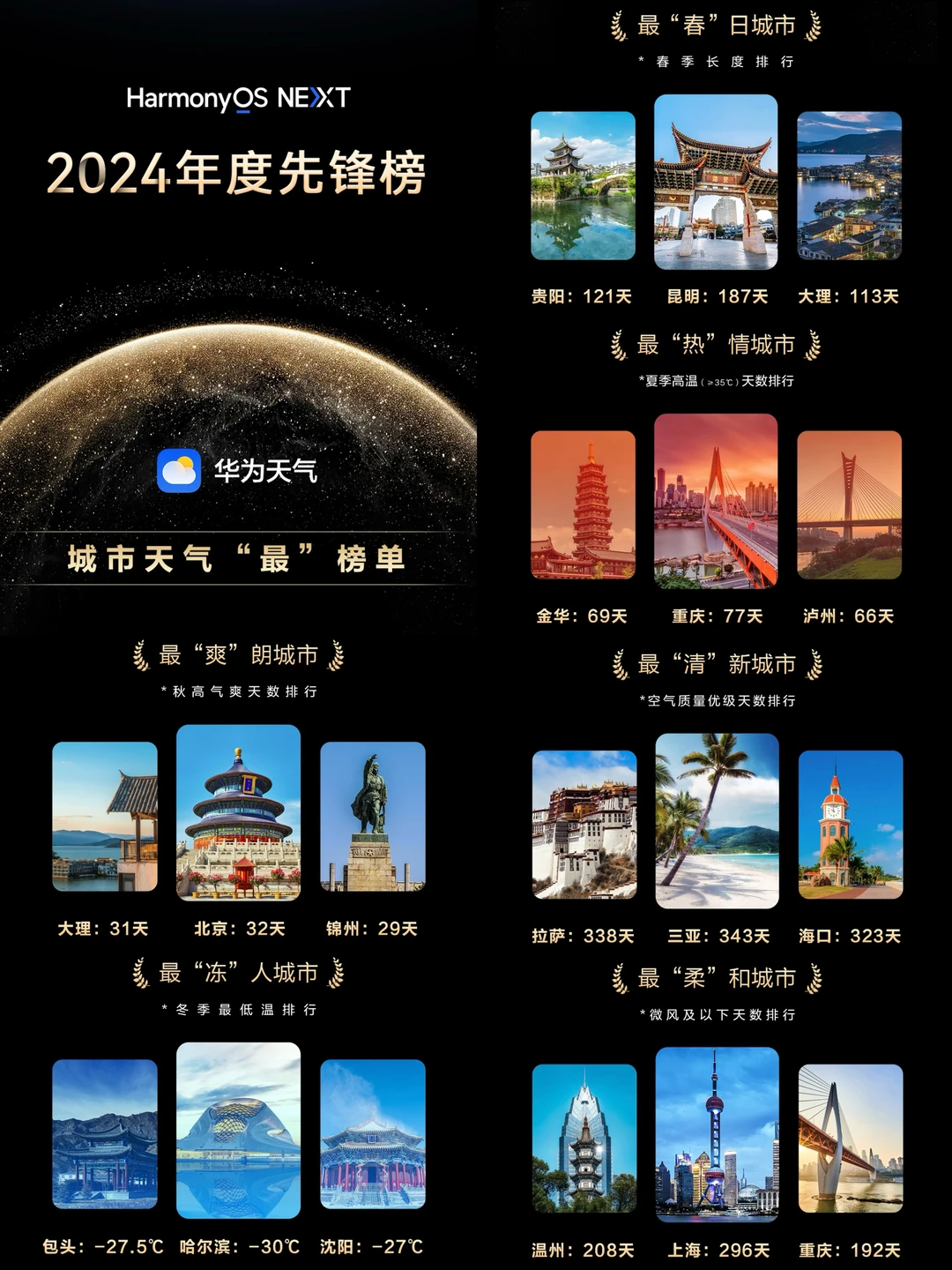 年终之际,常常使用的华为天气推出了2024年度城市天气总结,从四季天气纬度评选了许多城市,有春季时间最长的昆明,夏季高温时间最长的重庆,秋高气爽时间最长的北京,冬季温度最低的哈尔滨,还有很多小众城市上榜,或许这些没去过的地方,明年都要一一去打卡!