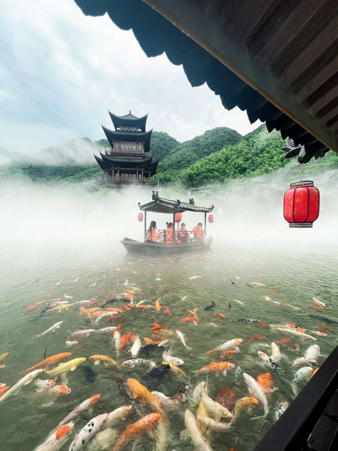 景区最有特色的建筑,“南朝四百八十寺,多少楼台烟雨中”形容它最合适不过。在池中泛舟,锦鲤能跟着转出一副八卦图。