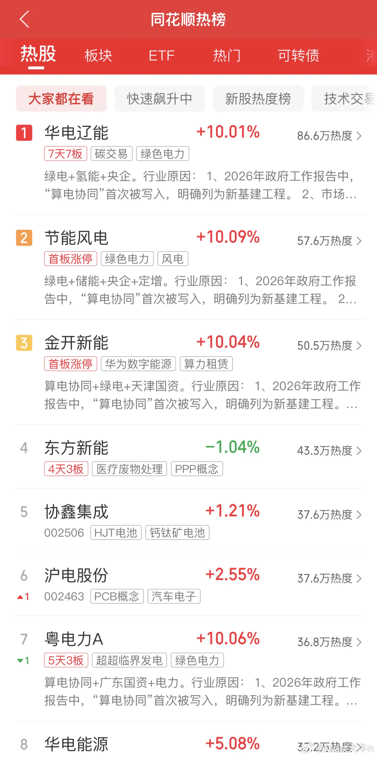 2026年3月24日,章盟主净买入1.82亿,各大股吧前十热股:淘股吧: 1.新能泰山 2.辽宁能源 3.中利集团 4.拓日新能 5.韶能股份 6.仁信新材 7.浙江新能 8.节能风电 9.金开新能 10.华电辽能东财吧: 1.华电辽能 2.节能风电 3.拓日新能 4.金开新能 5.协鑫集成 6.华银电力 7.美丽云 8.长城军工 9.中利集团 10.汉缆股份同花顺: 1.华电辽能 2.节能风电 3.金开新能 4.东方新能 5.协鑫集成 6.粤电力A 7.华电能源 8.浙江新能 9.美丽云 10.豫能控股
