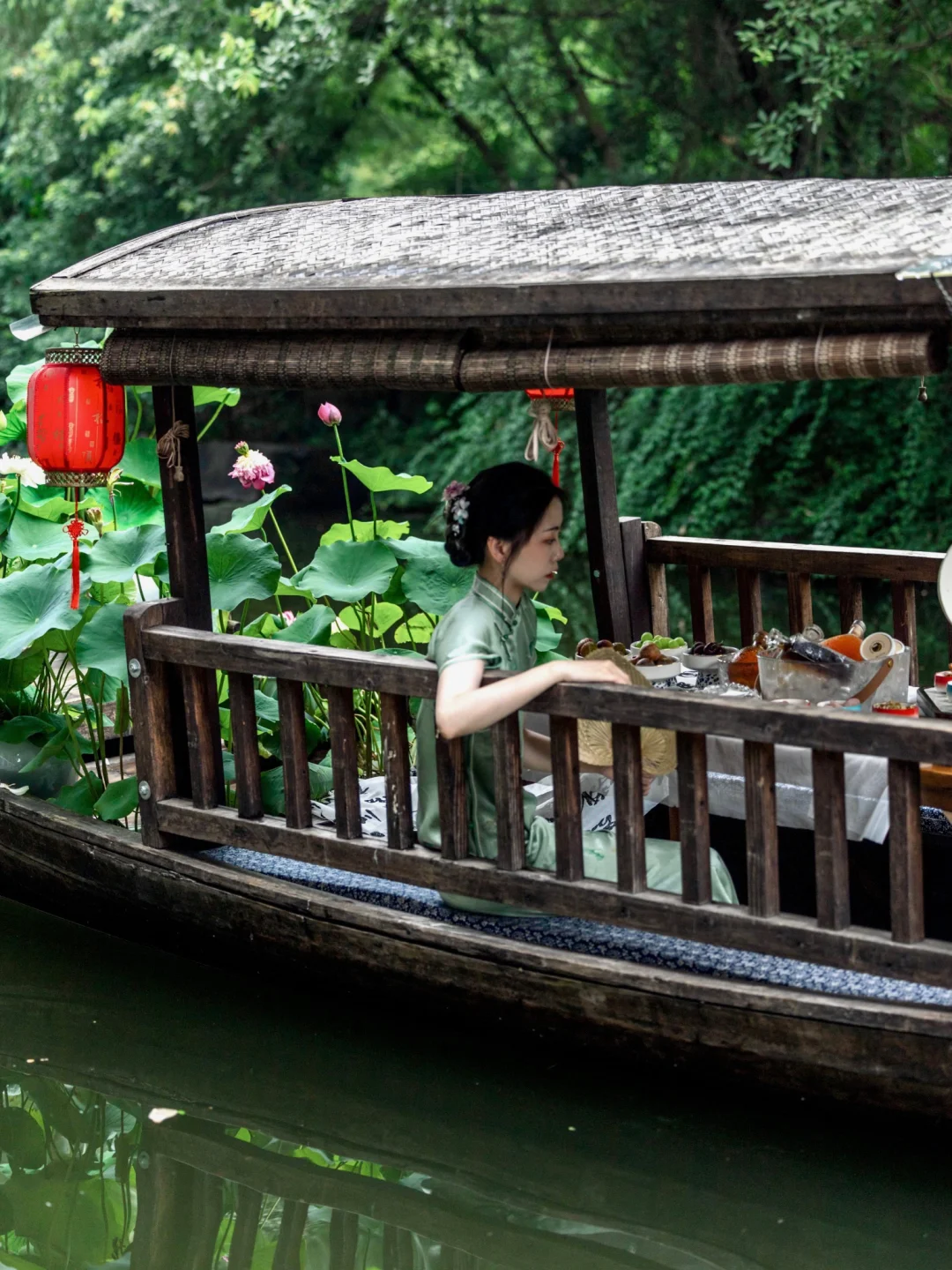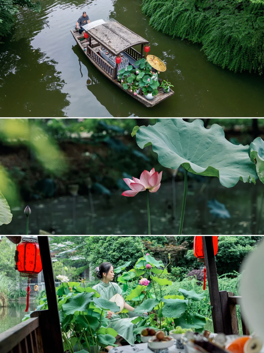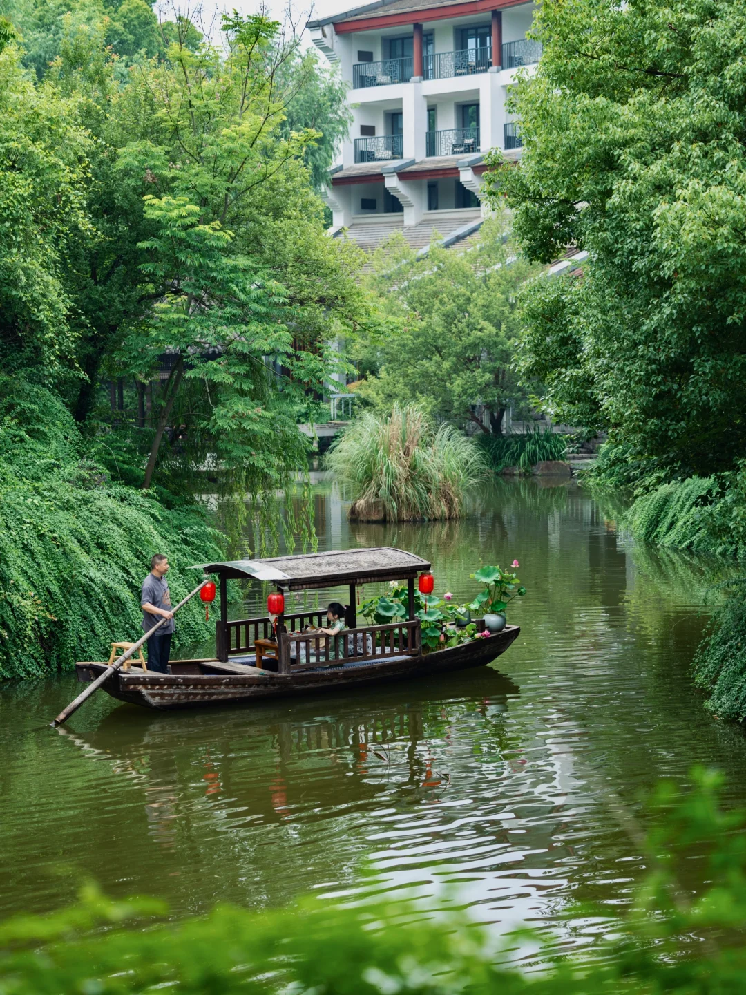 在船头装饰了荷花,加上中式的氛围布景,很适合穿上汉服或者旗袍来打卡。我们当天恰逢一阵小雨,划着船桨就进到了烟雨江南。游船范围都在酒店的专属水域,每个小时只安排一艘船,因此也格外幽静雅致。