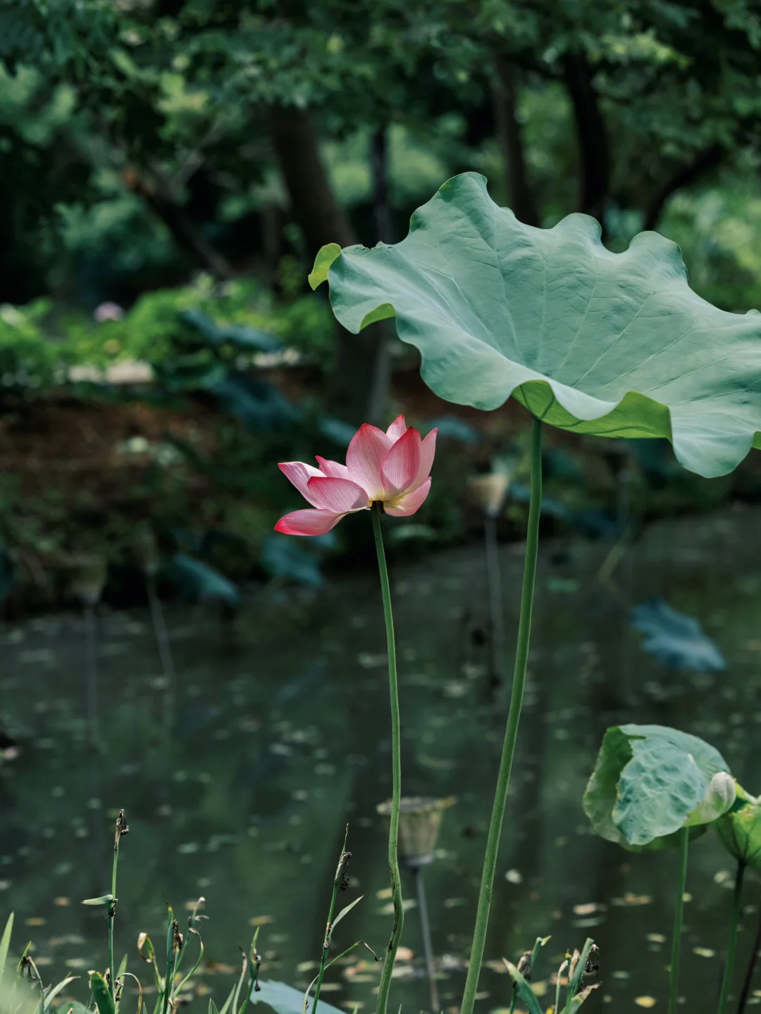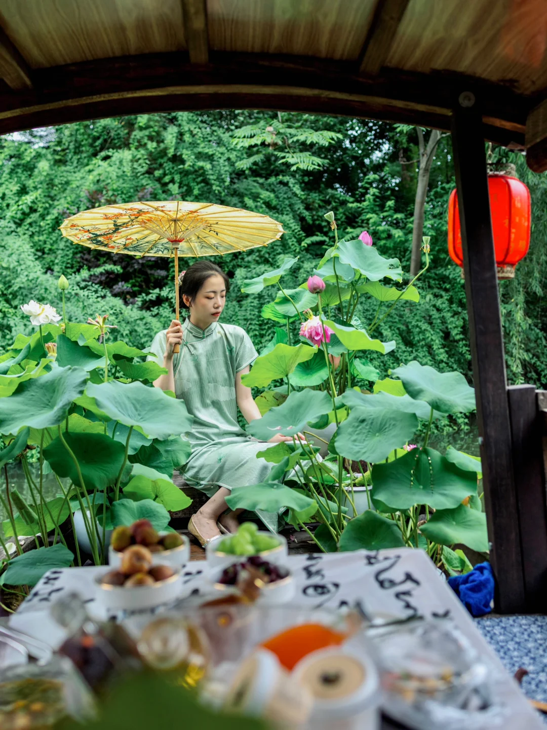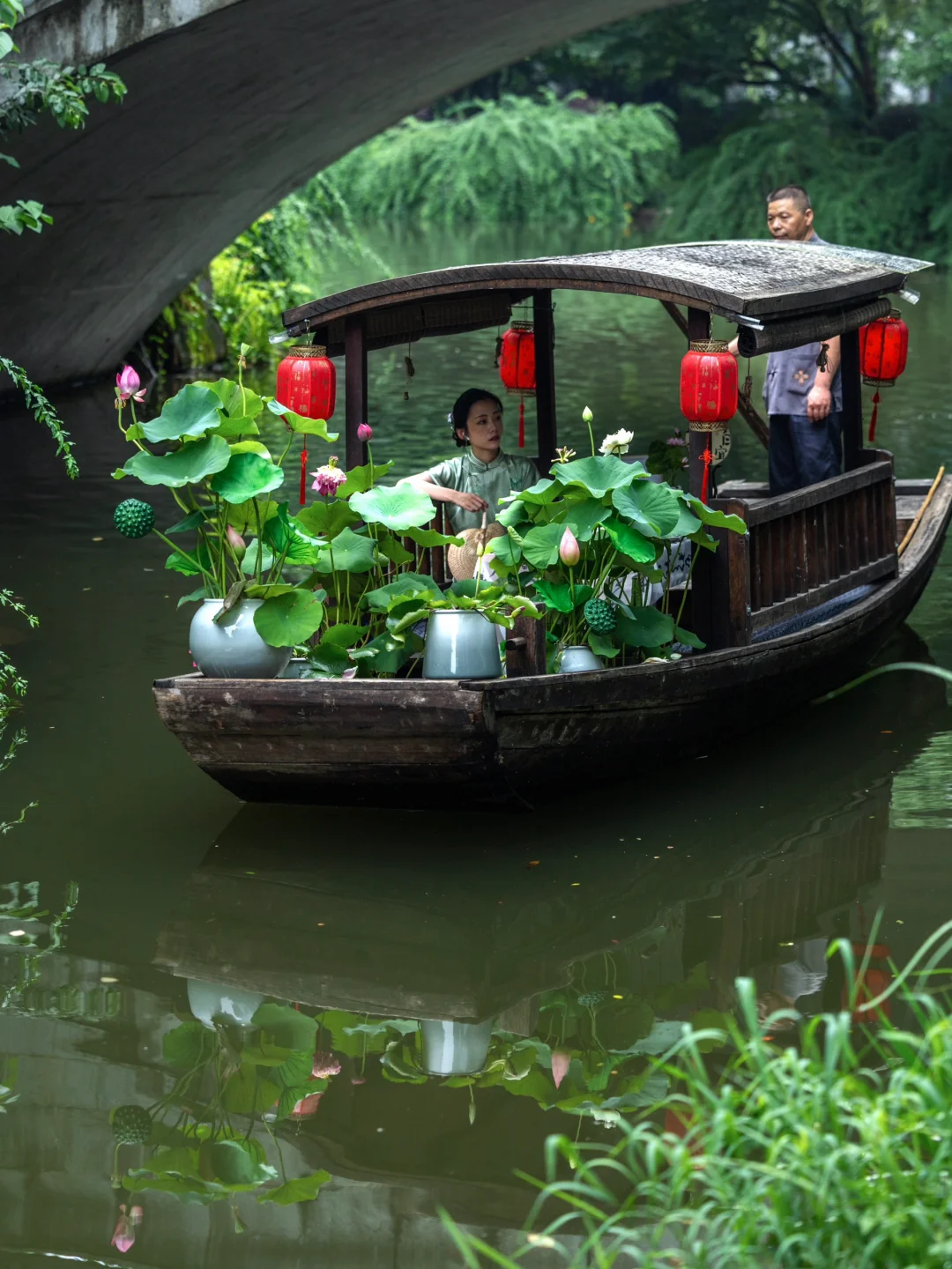 在船头装饰了荷花,加上中式的氛围布景,很适合穿上汉服或者旗袍来打卡。我们当天恰逢一阵小雨,划着船桨就进到了烟雨江南。游船范围都在酒店的专属水域,每个小时只安排一艘船,因此也格外幽静雅致。