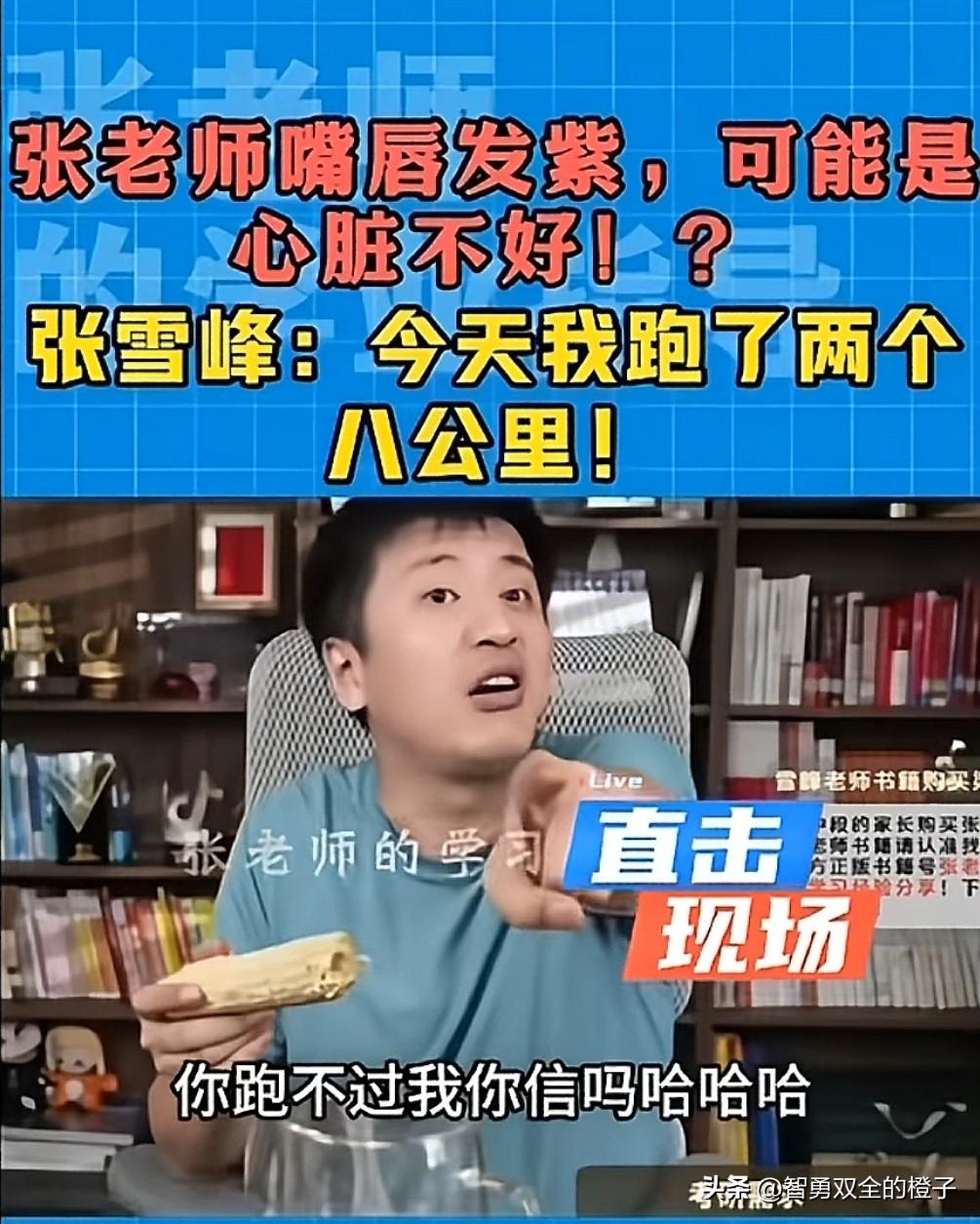 事实再一次证明:听人劝,吃饱饭! 张雪峰直播的时候,看到有一条弹幕说他嘴唇发紫,可能心脏不好,网友本是好心提醒,他却开始教育起那位网友。 张雪峰指着那位网友说:“我一个跑半马的人,你说我身体不好,你都跑不过我,你信吗?你说我肾不好都行,但我心脏肯定没问题,我今天还跑了两个8公里!” 其实也不止网友提醒过他,前两天他报名无锡马拉松时,就被官方拒绝了,估计也是考虑到他的身体原因。 但他还是没有引起重视,还发了一条朋友圈表示不满,说他本月已经跑了72公里,来证明他的身体很好。 事实证明:术业有专攻,隔行如隔山,张雪峰虽然填报志愿很在行,但他真的没有医学常识,而且还不听劝。 或许他能把网友的话听进去,去医院做个检查,不要大量跑步,或许就没事了!