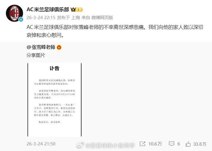 AC米兰足球俱乐部发文悼念张雪峰2026年3月24日,知名教育从业者、峰学蔚来创始人张雪峰因心源性猝死,经全力抢救无效于当日15时50分在苏州逝世,享年41岁。当晚22时15分,AC米兰足球俱乐部官方微博发布悼念声明,向这位资深中国球迷致以哀思,全文为:AC米兰足球俱乐部对张雪峰老师的不幸离世深感悲痛。我们向他的家人致以深切哀悼和衷心慰问。