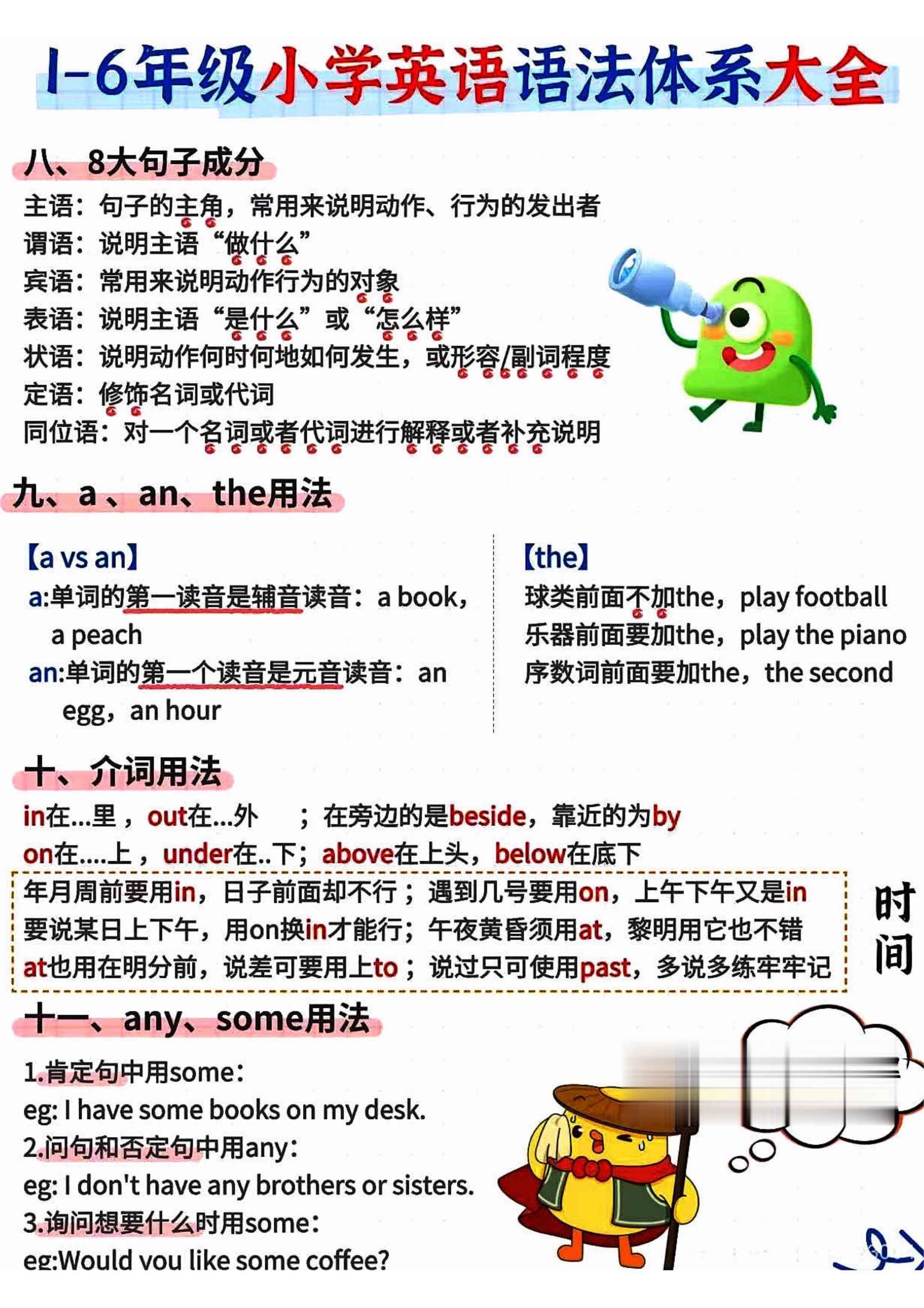 小学1-6年级英语语法体系大全知识汇总。技巧学习