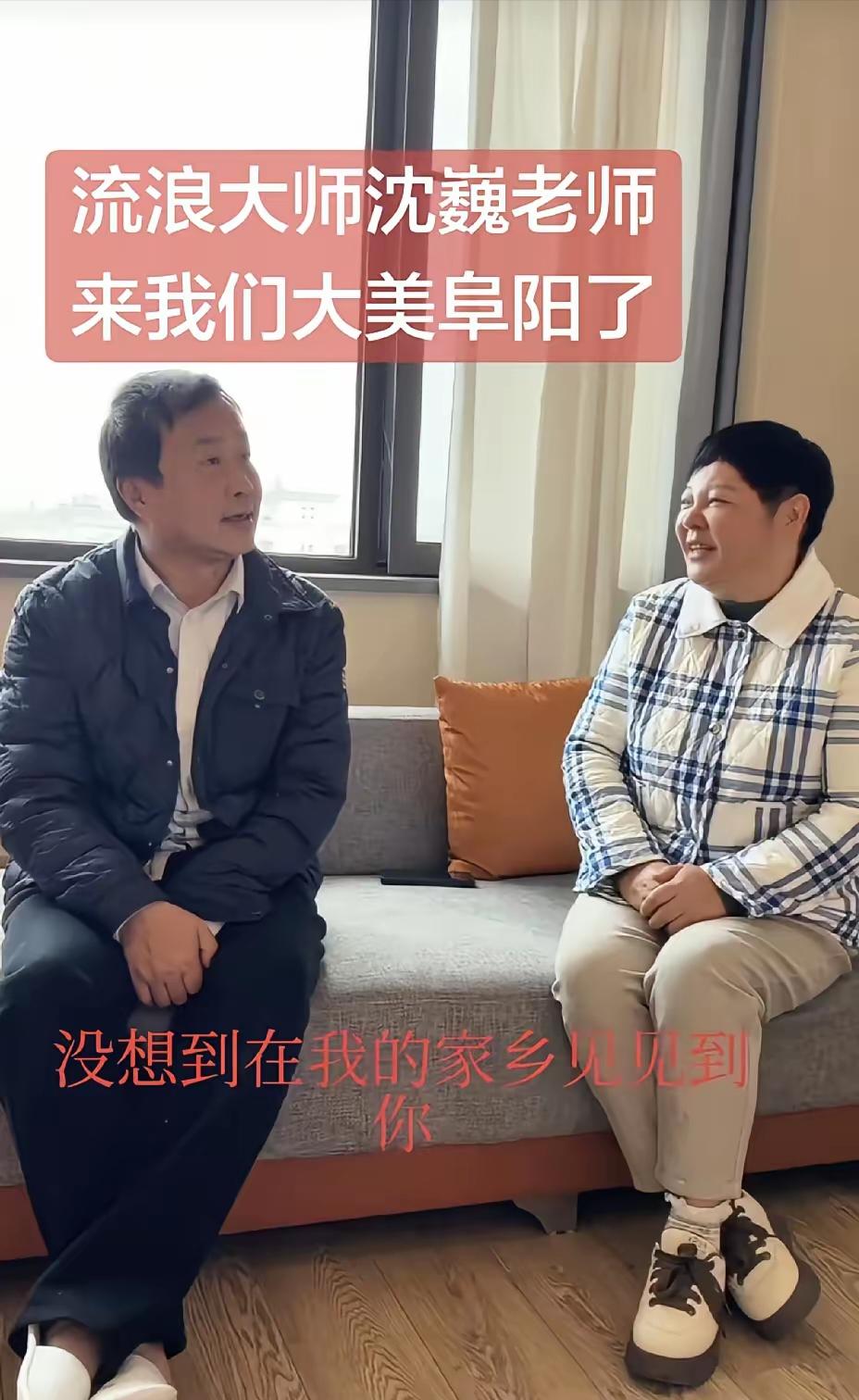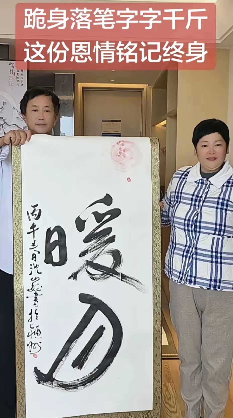 沈巍在阜阳,朴实的女粉丝来见他,他跪地写字相赠,没带印章,就直接按手印,刘辛协助,沈老师大笔一挥,写下“暖日”二字,应该和“阜阳”形成了照应,也代表他和粉丝的心情,心里都是暖暖的,这位女粉丝好像就是电话里说要请他吃饭的那位。