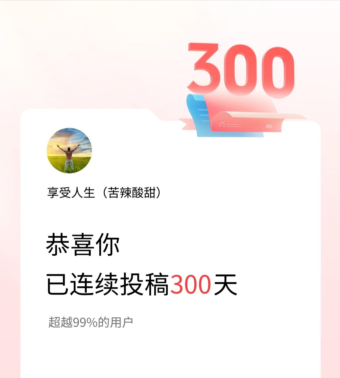 学习和创作仅仅是为了明天,更是为了丰富今天的自己。 昨天收到头条平台信息,恭喜你 己连续投稿300天 时间,在不经意间悄悄的流逝,不知不觉中,己连 续向头条台投稿300天了。 300天,耗费了日日夜夜,300天背后,积蓄起来,是一连串的很大数字。 今天回头看一看,300天里发表的作品,还没有一篇所谓的爆款文章,有些遗憾。 坚持,坚持!争取连续投稿600天,有个惊喜。 任何值得到达目标,都没有捷径,给自己一点时间,相信自己还有一场蜕变。 学习是一生的旅程,而不是简短的冲刺。珍惜每一次学习的机会,因为知识是唯一无法夺走的财富。