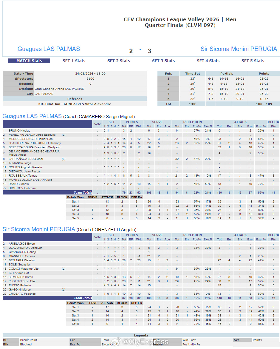 【欧冠男排1/4决赛I佩鲁贾3-2险胜拉斯帕尔马斯 10人得分上双】国际排坛战报速递 3月24日拉斯帕尔马斯,欧冠男排1/4决赛首回合,卫冕冠军意大利佩鲁贾客场苦战五局,3-2(25-23/25-19/21-25/23-25/15-13)艰难战胜西班牙拉斯帕尔马斯,取得11连胜。本塔拉28分、普罗特尼茨基20分、鲁索14分、MVP塞曼纽克13分、克罗萨托10分,贝泽拉-索萨20分、门德斯15分、胡安托雷纳和拉莫斯各14分、卢梭11分。