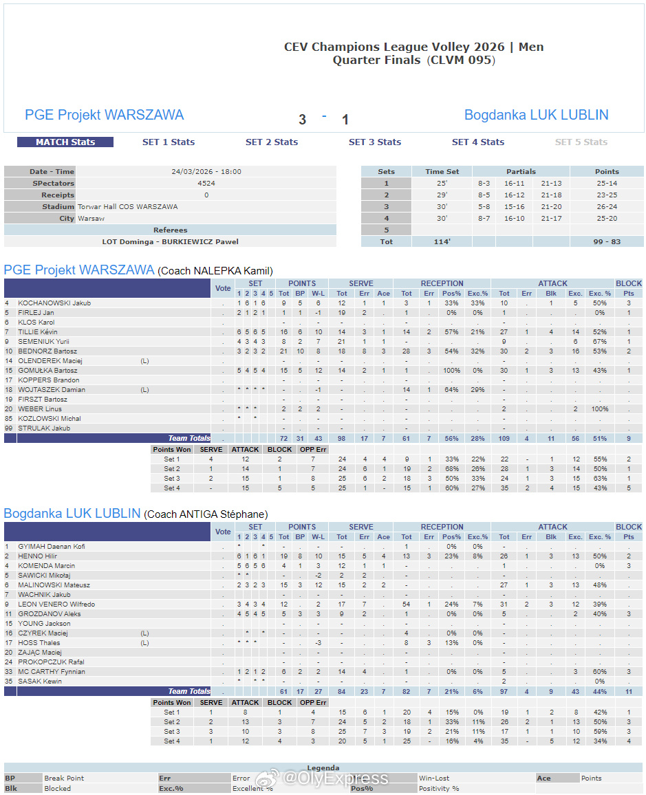 【欧冠男排1/4决赛波兰德比 华沙3-1卢布林拔头筹】国际排坛战报速递 3月24日华沙,欧冠男排1/4决赛首回合波兰德比战,华沙主场3-1(25-14/23-25/26-24/25-20)战胜卢布林。贝德诺兹21分、MVP蒂略16分、格姆乌卡15分,亨诺19分、马林诺夫斯基15分、莱昂12分。