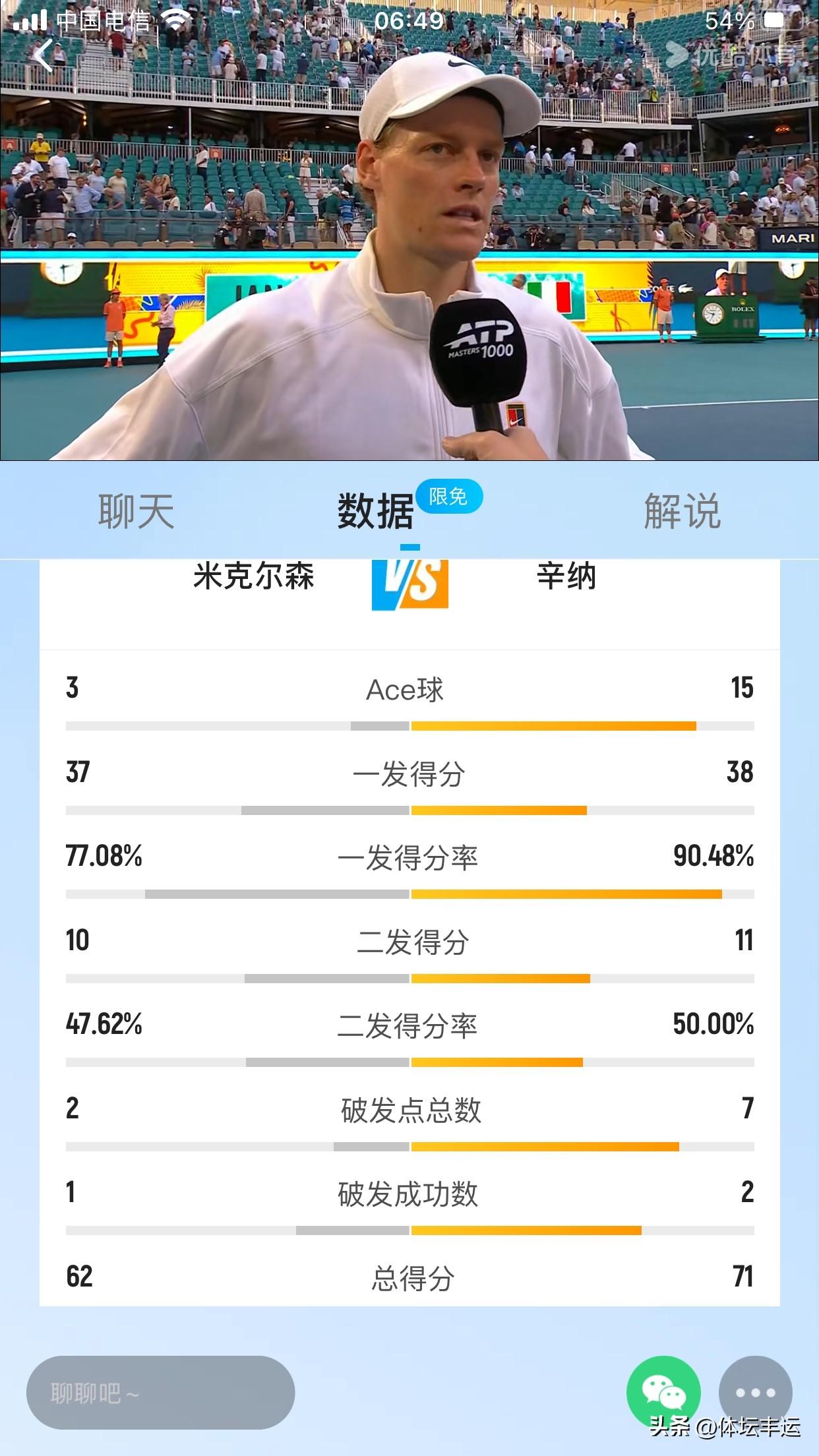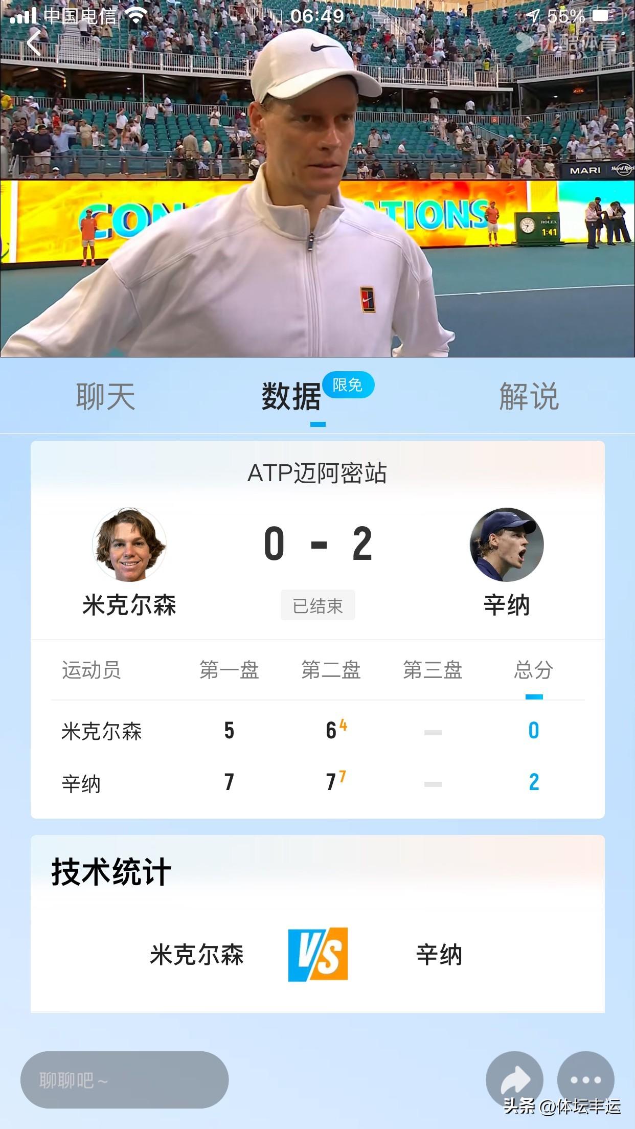 辛纳险胜米克尔森晋级男单八强🔥🔥 刚刚🔚的迈阿密网球公开赛男单第四轮1/8决赛第五场比赛,2号种子意大利辛纳7-5、7-6(4)战胜美国米克尔森晋级! 第一盘比赛,双方比分紧咬,米克尔森的发球局一度固若金汤,但辛纳凭借着精湛的技术和出色的心理素质,抓住机会破掉了米克尔森的发球局,最终以7 - 5艰难拿下第一盘。 来到第二盘,米克尔森调整状态,加强了进攻,给辛纳制造了不小的麻烦。比赛进入抢七阶段,现场气氛紧张到了极点。辛纳在关键时刻稳住心态,凭借着稳定的发挥和果断的击球,以7 - 6(4)锁定了胜局。