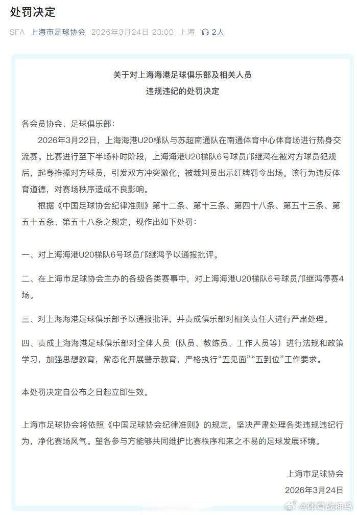 多名球员停赛,程鑫、张浩楠停赛8场,薛天翼停赛5场,季桑楠停赛3场,这样球队的多名主力球员将会缺席苏超的前面几场比赛。南通队赛场暴力行为遭江苏足协重罚