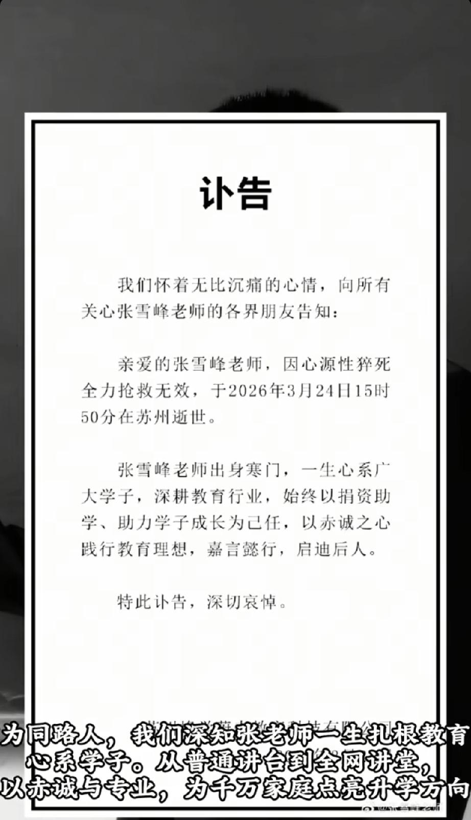 张雪峰离场:一个教育顶流,和他背后的焦虑时代。 2026年3月24日,苏州峰学蔚来教育科技有限公司发布讣告,确认创始人张雪峰因心源性猝死,经全力抢救无效于当日15时50分逝世,年仅41岁。这个以“帮普通家庭选对专业”为标签的教育顶流,在41岁的盛年骤然离场,不仅让无数考生与家长泪洒直播间,更成为映照当下教育焦虑与社会转型的一面镜子。 一、顶流的陨落:生命最后的信号与瞬间 3月24日中午12时26分,张雪峰在公司跑步后突发身体不适,被紧急送往医院抢救 。此前一天,他的马拉松参赛名额已因体检未达标被组委会取消,这一细节成为生命预警的关键佐证。生前最后一次直播中,他状态明显疲惫,不时揉搓太阳穴、强撑倦意,甚至哽咽着说出“这可能是你最后一次在网上看见我”,这句邀约最终成了无法兑现的承诺 。 从寒门子弟到教育意见领袖,张雪峰的一生始终与“奋斗”绑定。他出身黑龙江齐齐哈尔农村,靠郑州大学学历实现阶层跨越,深耕升学规划领域十余年,用直白甚至“刺耳”的表达,拆解高校专业与就业逻辑,成为千万普通家庭的“报考灯塔”。但长期高强度的工作透支,成为压垮他的最后一根稻草——日均工作超12小时、全年无休,即便曾因胸闷心悸入院治疗,高考考研季一到便立刻回归岗位。 二、崛起与争议:实用主义背后的焦虑具象化 张雪峰的走红,本质是教育信息差壁垒的平民化冲击。在教育资源分配不均、升学报考信息不对称的背景下,他将晦涩的志愿填报规则转化为通俗逻辑,提出“城市>学校>专业”的选择铁律,揭露“国际本科陷阱”“烟草系统招聘潜规则”等内幕,推动志愿填报从“盲选”走向数据化。权威数据显示,2023年约20%-25%的考生因他调整专业选择,他推荐的兽医、护理等民生专业录取位次小幅上升,而被点名“避雷”的新闻、金融等专业录取位次有所降低。 但他的争议从未缺席。早期“文科生就是服务业”“新闻专业直接打晕”等言论,因贬低人文社科、加剧专业鄙视链引发全网震怒,遭官媒批评“将教育简化为粗暴的投入产出计算”。他被贴上“贩卖焦虑”“功利化教育”的标签,一方面被家长视为帮普通家庭规避风险的“英雄”,另一方面被学界指责“误导年轻人,动摇教育多元性”。这种两极分化的评价,恰恰折射出实用主义与理想主义的时代碰撞——底层家庭无法承受选错专业的代价,而精英阶层保有试错资本,他的建议不过是不同家庭“容错率”差异的折射 。 三、时代的镜像:张雪峰离场,焦虑从未退场 张雪峰的离场,不仅是一个个体的消逝,更是焦虑时代的沉痛注脚。他的崛起与争议,本质是社会转型期教育供需错位的产物:学历通胀背景下,就业压力攀升,家长与学生迫切需要确定性答案;传统权威公信力下降,大众转向市场化信息源;而教育公共服务供给不足,为民间意见领袖留下巨大空间。 他的离去,也让人们重新审视教育的本质与焦虑的代价。张雪峰曾说,自己的初心是“展示选择的不同面向,先有认识的深度,才有选择的广度”,但在流量与商业的裹挟下,他的表达逐渐走向极端。他教会无数人“上岸”,却最终没能逃过自身的命运困局——贩卖焦虑的人,终究被焦虑反噬;教人“避坑”的人,自己正走在最大的坑里。 四、留下的叩问:教育如何平衡现实与理想 张雪峰的离场,留给社会三大核心思考: 1. 教育信息普惠的缺口谁来填补?他的免费内容占比超80%,成为农村及三四线城市家庭的“兜底选择”,他的离去或导致信息壁垒重现,普通家庭的报考安全感将大幅降低。 2. 功利化教育的边界在哪里?教育既要回应生存现实,也要守护理想与多元价值,过度推崇实用学科、弱化人文素养,终将扭曲教育初心。 3. 个体奋斗与健康的平衡如何实现?张雪峰的悲剧警示所有人,在追逐目标的路上,健康永远是第一位的,焦虑与内卷的成本,终将由个体承担。 斯人已逝,精神长存。张雪峰或许有争议,但他为普通家庭争取教育知情权的努力、对教育公平的推动,值得铭记。而他的离场,更提醒着每一个人:教育不是唯一的出路,健康与生活,永远是人生的第一要义。愿焦虑的时代多一些温柔,愿每一个奋斗者都能守住身心的平衡。教育大v张雪峰 张雪峰访谈 张雪峰简历 张雪峰停播 张雪峰账号异常 张雪峰怒怼评委