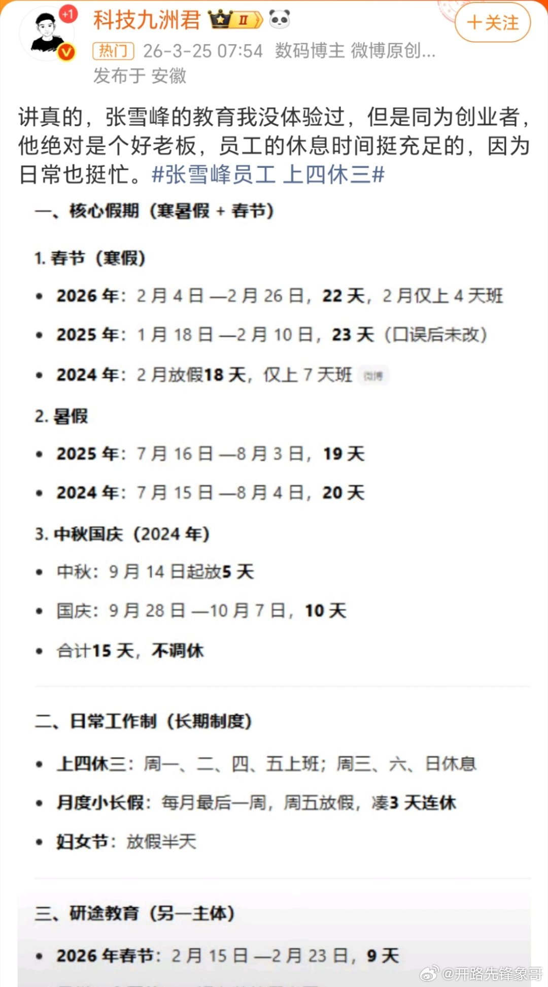 张雪峰员工 上四休三现在有人提出来他的模式上四休三,不知道这个想法是不是来源于他,