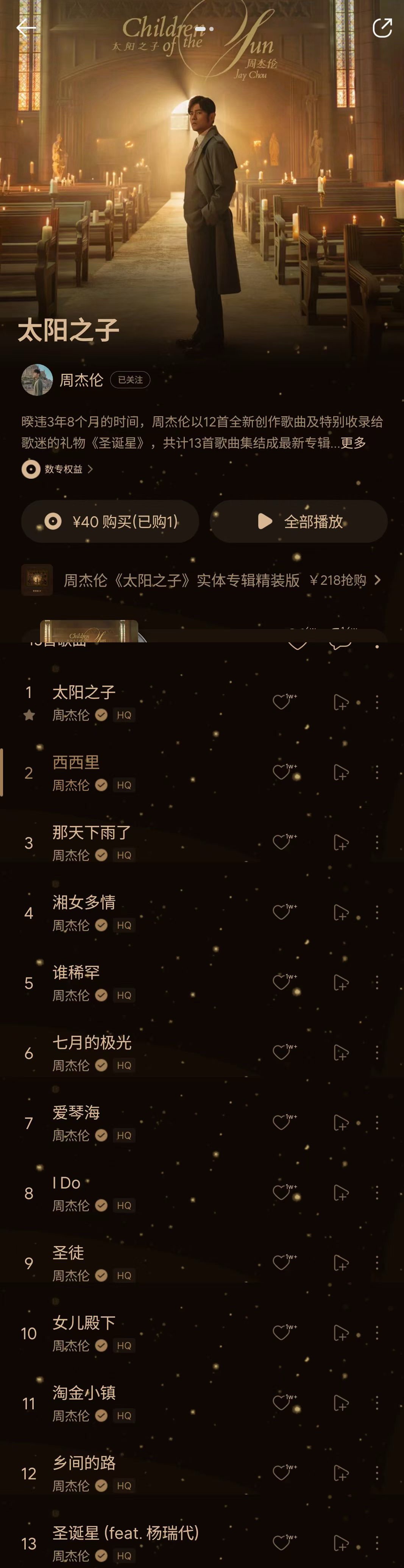 周杰伦新专辑《太阳之子》全部听完,单曲从夯到拉来了,《女儿殿下》、《那天下雨了》