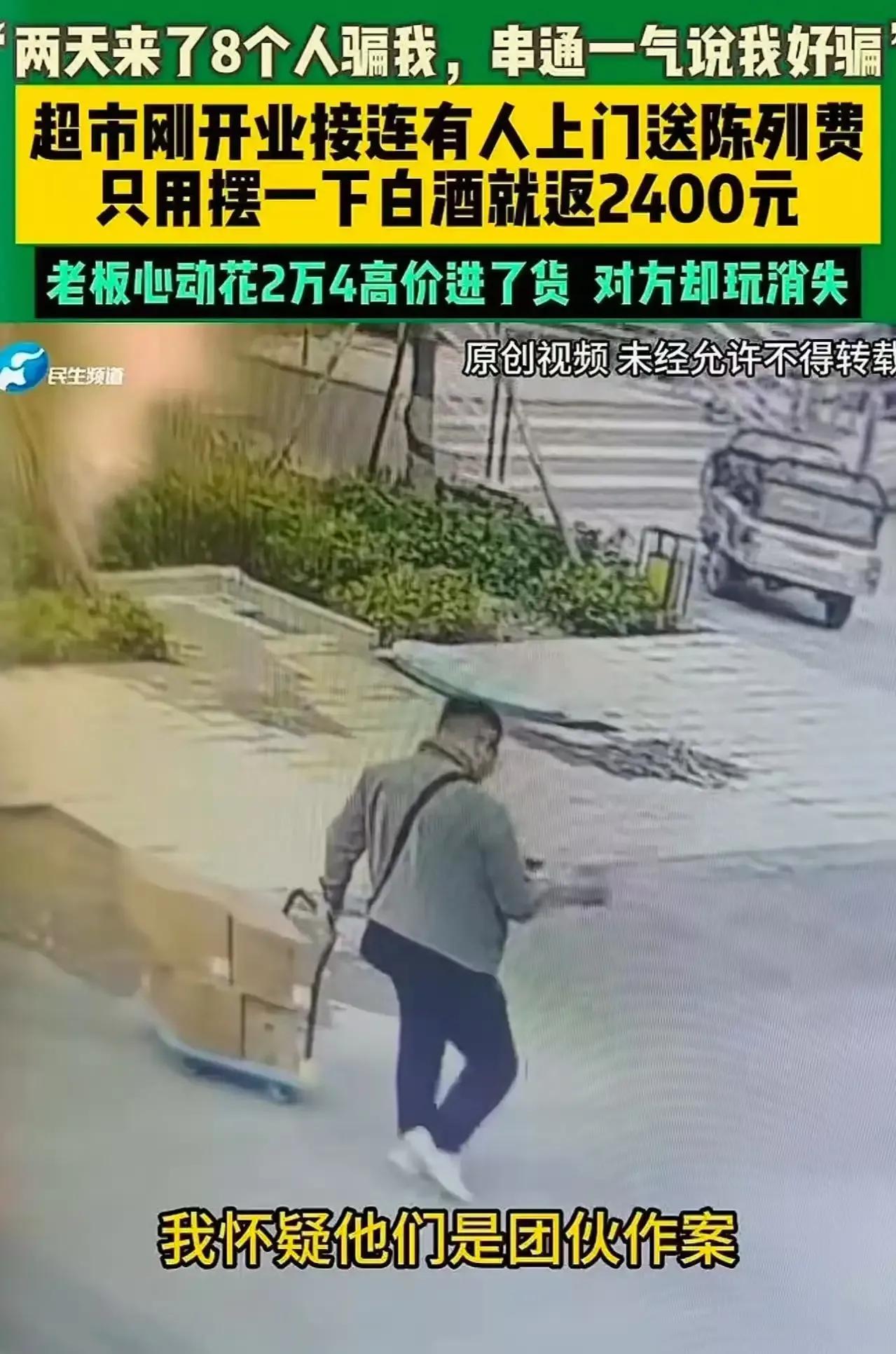 河南郑州一男子新开超市,竟遇“天降馅饼”?有人愿付高额陈列费卖白酒,结果却让男子血本无归,这究竟是怎么回事? 原来,这位男子新开了一家超市,不久就有人找上门来,表示愿意支付每月2400元的陈列费,将他们的白酒铺在超市货架上售卖。男子一听,这岂不是白捡的便宜?于是,他毫不犹豫地掏了24000元进货。然而,钱付了,货进了,对方却像人间蒸发了一样,再也联系不上了。这时,男子才如梦初醒,意识到自己上当受骗了。网友们纷纷表示,这明明就是一个骗局,既然是借用货架陈列货品,男子只管收保管费就好,干嘛还要自己出货品钱呢?其实,这就是骗子利用人们贪小便宜的心理,先给你点甜头,再让你陷入更大的陷阱。就像网友说的,一个陌生人说给你送钱,你可能会警惕;但八个陌生人排着队给你送钱,你的大脑就会自动屏蔽风险,强行合理化这一切。 天上不会掉馅饼,贪小便宜往往容易吃大亏。大家在面对类似的“好事”时,一定要保持警惕,切勿被一时的利益冲昏头脑。对此,你有什么看法呢?快来评论区留言讨论吧!白酒价格陷阱 郑州白酒销售