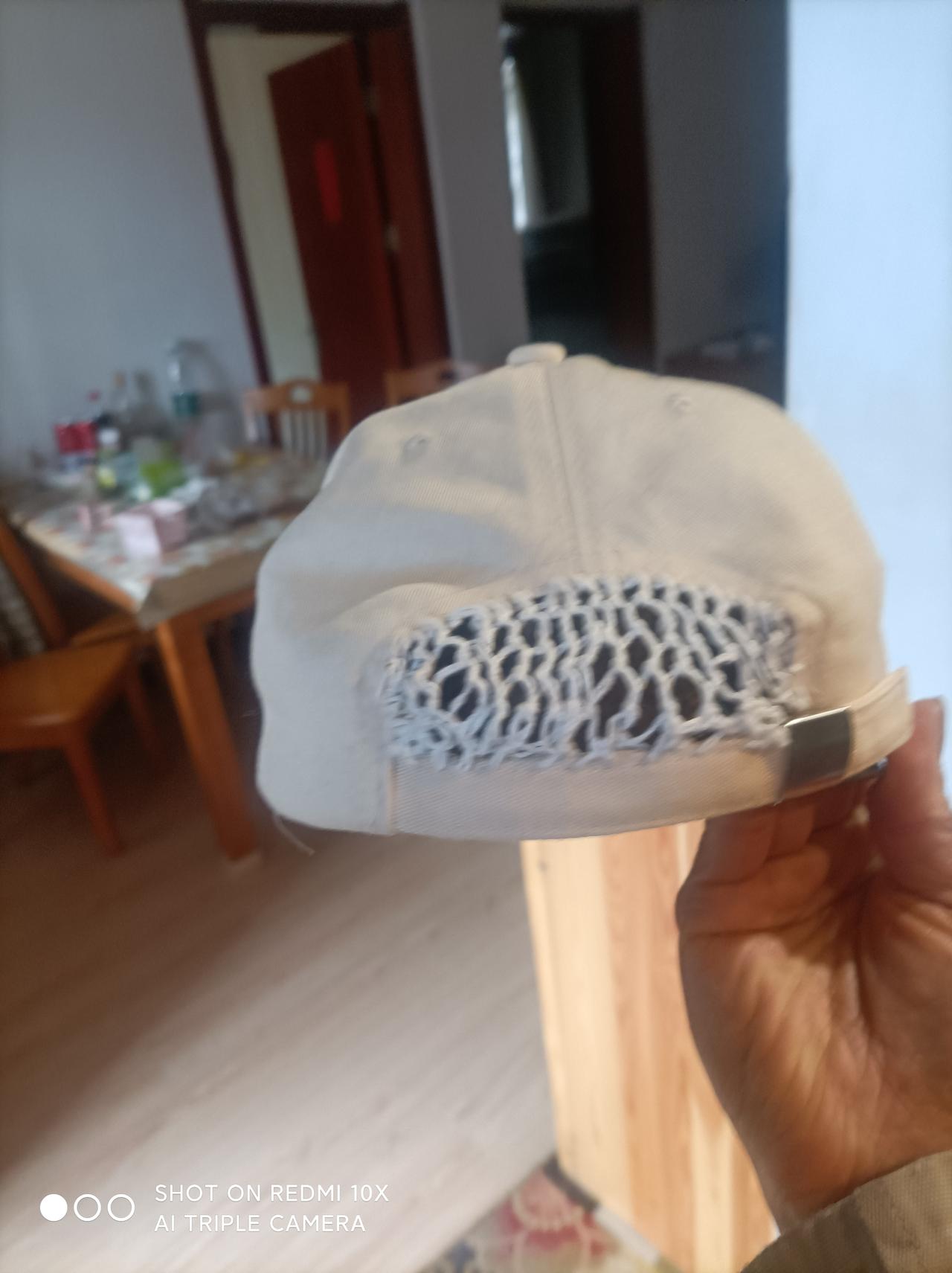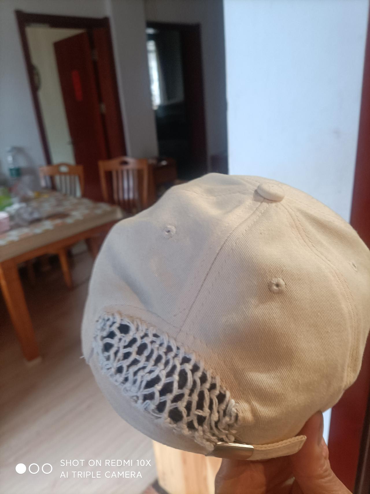 帽子的讲究和补缺一一 帽子是人们生活中,不起眼的穿戴小物件。 当前市场流行的帽子颜色、款式、厚薄丰富多彩,五花八门,各显千秋! 其实,帽子看似小件,其作用对人体健康保护,功不可没; 冬天防寒保暖;夏天遮阳挡热、保护眼睛,是它的独有功能! 此外,佩戴帽子是男女头面妆饰、展示美丽效应既简单、又实惠的一项受益消费! 目前,最流行的一种男女通用遮阳帽,深受各层次人们喜爱,市场潜力兴旺。 这种款式帽子,对女同胞来说很实用、无缺陷! 对于男同胞来说效果也不错,只稍有不足的是:后面的扎辫孔偏大,有外露浅发、沒全遮盖后脑硕之小缺陷! 为了补上这点不足,我想了想,能否把这个孔堵上,既不影响使用,又不影响美观,那该多好! 嘿嘿,我突然想起,如果用块小网状布片缝上不解决了;于是,我找出针线(上被子粗线),随手缝、织小网孔同时进行于帽后补洞操作。 要注意的是:网眼大小一样,网片与整体帽孔要稍松驰一点,便于拉扣松紧方便使用。 友友们如果自己不满意帽后孔洞,也可动手,这样试试填补缺陷喔!