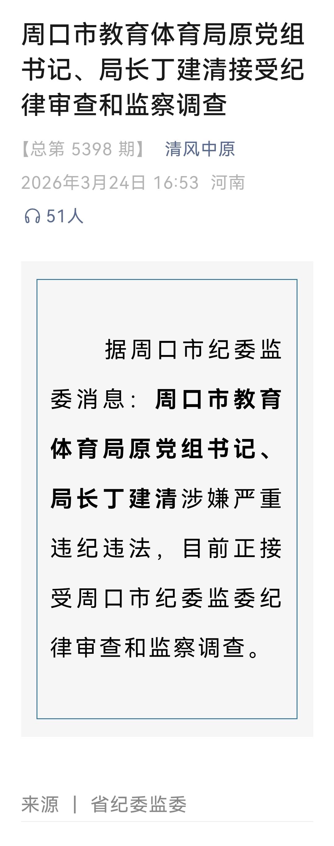 利剑周口!市教体局原局长丁建清落马! 2026年3月24日16:53,周口市纪委监委又通报了一则重要消息,周口市教育体育局原党组书记、局长丁建清涉嫌严重违纪违法,目前正接受审查调查。 从主管教育的部门“一把手”沦为违纪者。 下面大家跟随小编的脚步,一起来了解一下丁建清的人生履历。 丁建清,网上关于他的公开资料很少,出生年月不详,学历信息不详。 但从官网发布的照片来看,他身穿黑色行政夹克,头发浓密且乌黑,眼睛很小,眼袋很大,身体略微肥胖,双下巴明显,单从外貌来看,年龄最少也在50岁往上。 他从2010年起,就开始担任周口市政府副秘书长,专职负责对接,协调全市教育、体育领域的政务工作。 并且在2015年9月至2019年1月,这4年时间里,担任周口市体育管理局管理岗位,主持全市体育事业发展、体育设施建设,全民健身推广等相关工作。 于2019年2月至2025年11月,这6年时间里,历任周口市教育体育局党组副书记局长,党组书记局长。 可以说是周口市教育领域的主管核心领导,全面主持市教体局党政全面工作,统筹全市教育教学、体育发展、师资建设、校园安全、教体项目审批等重要事务。 并且在2025年12月至2026年3月期间,这个时候他已经卸任了周口市教体局党组书记、局长的职务,转任周口市人大常委会教科文卫工委副主任。 在去年12月份的时候,他还出席了周口市教体局领导班子调整会议,完成了工作交接,正式卸任党组书记、局长职务。 这样一位在周口市教育系统任职多年的核心要员,没想到也没有经受住糖衣炮弹的侵袭,在履职期间伸出了贪腐之手,触碰了法律红线,如今也是彻底栽倒在了任上。 丁建清的落马,并非个例。从其任职履历来看,他长期在教育、体育系统担任要职,从周口市政府副秘书长到市教育体育局局长,手中掌握着项目审批、资金分配、人事任免等重要权力。然而,他却未能守住廉洁底线,最终因涉嫌违纪违法被查,不仅断送了自己的政治生涯,更损害了教育系统的公信力。 教育是国之大计、党之大计,关乎千家万户的切身利益。教育系统的公职人员,尤其是领导干部,肩负着立德树人、推动教育事业发展的重任。一旦权力被滥用,不仅会扭曲教育资源的公平分配,还会侵蚀教育的纯净土壤,影响下一代的健康成长。丁建清案的发生,再次警示我们:教育系统并非腐败的“避风港”,任何触碰纪律法律红线的行为,都必将受到严惩。 丁建清案也提醒我们,加强公职人员的廉洁教育刻不容缓。教育系统的干部教师,既是知识的传授者,也是学生品德的示范者。如果自身存在廉洁问题,不仅会影响教育教学质量,还会对学生的价值观产生负面影响。 因此,必须把廉洁教育纳入教育系统干部教师培训的重要内容,通过开展专题讲座、案例警示教育、廉政文化建设等活动,引导干部教师树立正确的权力观、地位观、利益观,增强廉洁自律意识。同时,要加强师德师风建设,建立健全师德考核机制,对违反师德师风的行为实行“零容忍”,打造一支清正廉洁、师德高尚的教师队伍。