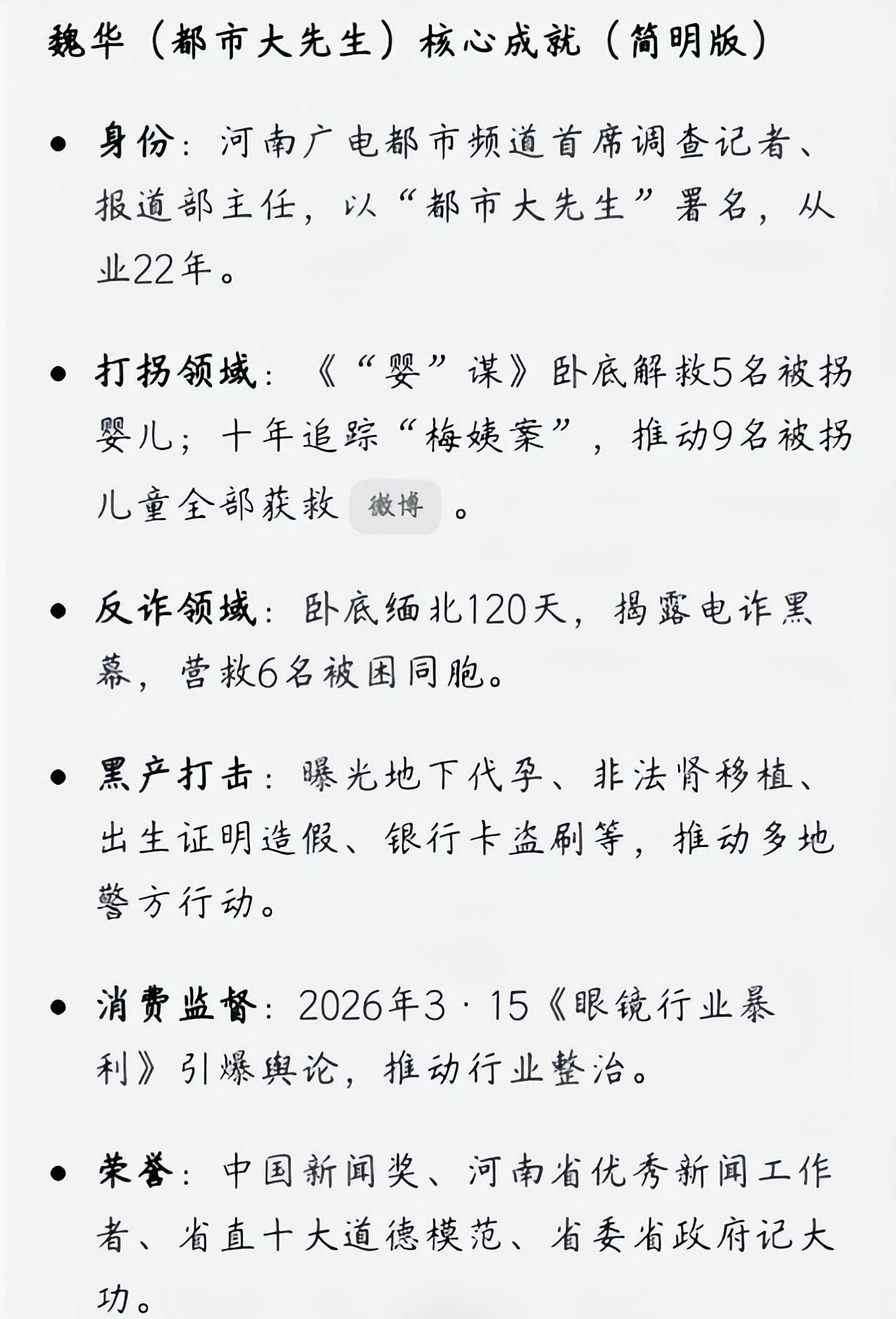 魏华先生45岁、张雪峰老师41岁,两位值得尊敬的人去世了。有人说不该把他们相提并论,因为出发点不同,但是我却不这么认为。 至于为什么有人觉他们的出发点不同,不能把他们相提并论。 原因是张雪峰老师是网络名人及商人,不但网上的售课价格不菲,名下更是拥有11家公司,网传资产早已过亿。他虽然帮助了无数学子,但本质上还是一名商人,在真正的帮助了别人的时候,自己也做到了“名利双收”。 魏华先生则不相同,作为一名记者,他经常卧底暗访各种“灰黑色”。长达20多年的调查中,揭开了一个又一个的内幕,而自己及家人的安全也屡遭威胁。为了安全,他极少出镜,一直默默地揭露着那些“灰黑色”内幕。直到去世后,他的事迹才被更多人知道,是一位真正不为财不为名的勇者。 不过,能不能把他们相提并论,个人感觉完全可以。 虽然他们的职业不同,工作风格更不一样,但是他们同样帮助了很多人,同样为广大民众做出了贡献。 如果说张雪峰是“考研名师”,是贫民学生的指路灯,那么魏华先生则是“一线斗士”,是撕破黑幕的一把利剑! 一个是张雪峰老师台前的指导,一个是魏华先生背后的付出,他们应该同样值得尊敬。