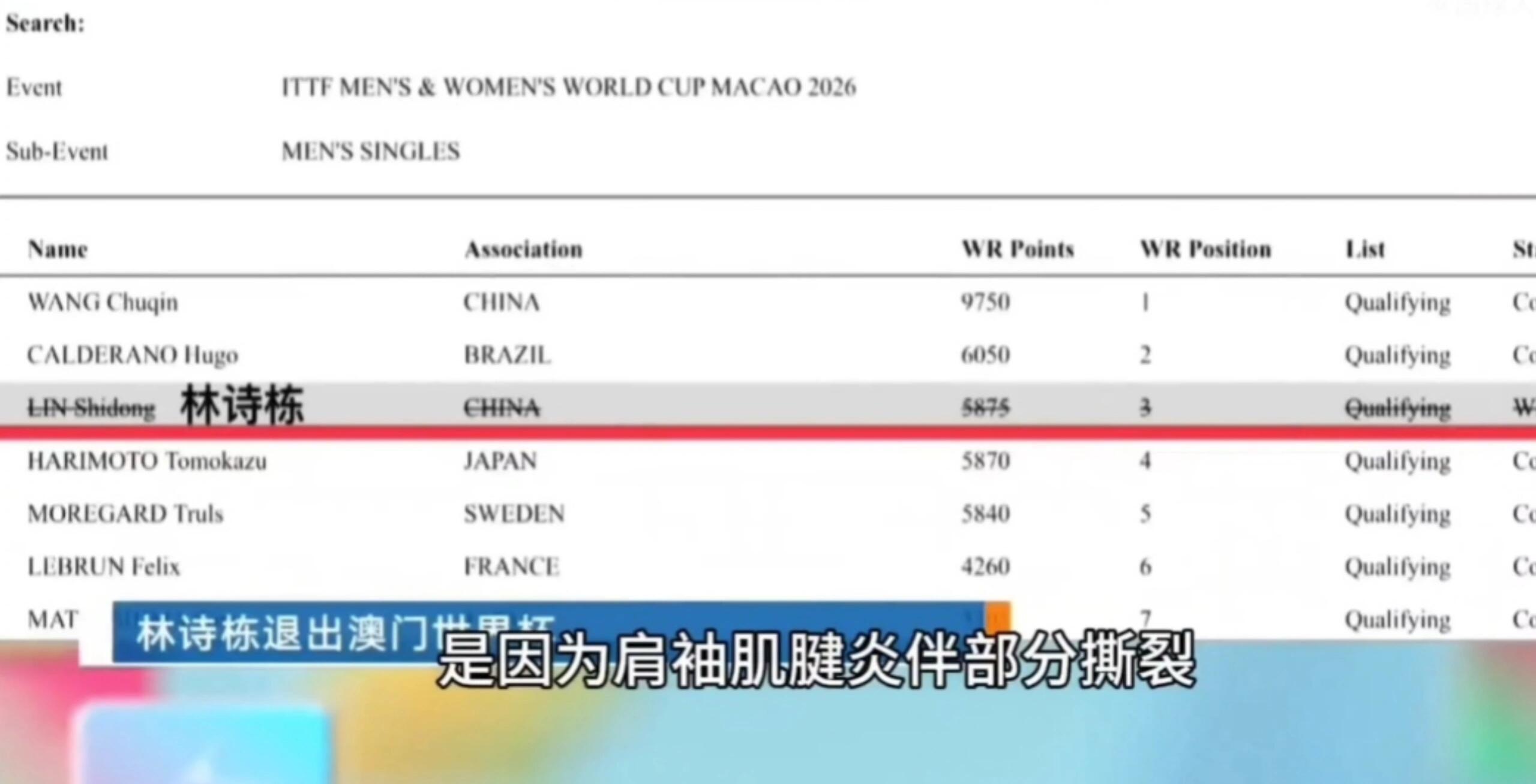 林诗栋澳门世界杯退赛原因公布肩袖肌腱炎伴部分撕裂,以及长期带上参赛,导致伤情反复