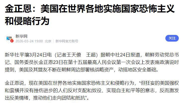 金正恩公开定性美国:恐怖主义国家! 3月24日朝中社报道,朝鲜领导人金正恩在结束最高人民会议发表讲话时,掷地有声地给美国贴上了“国家恐怖主义的实施者”这一标签。 这并非一时激愤的指责,而是朝鲜在长期观察和切身感受后,对美国行为的一次彻底定性。而朝鲜之所以会做出如此激烈的判断,是因为他们看到的美国,和许多人口中宣扬的那个美国,完全是两个样子。 金正恩在讲话中直指,美国及其盟友不断在朝鲜周边部署核战略资产,这严重动摇了地区的安全基础。这就像有人天天拿着武器在你家门口晃悠,还口口声声说是为了维护和平,谁能相信? 更让朝鲜警醒的是,美国在世界各地的所作所为。金正恩特别提到了美国对伊朗发动的战争,并将其视为“武力凌驾于国际准则之上”的铁证。 在朝鲜看来,伊拉克、利比亚等国的遭遇历历在目,这些没有核武器保护的国家,最终都难逃被干预甚至颠覆的命运。而伊朗当前的处境,更是让朝鲜坚信,没有足以制衡的硬实力,就只能任人宰割。 美国的行为模式被朝鲜看得一清二楚:顺我者昌,逆我者亡,所谓的国际规则不过是其实现自身利益的工具。 因此,朝鲜也得出一个冷酷却现实的结论:核武器不是炫耀的资本,而是生存的底线。 金正恩再次坚决拒绝了美国提出的“以核裁军换取安全保障”的提议。在平壤的逻辑里,这无异于猛虎要求羔羊先拔掉自己的角,再来谈和平共处。他们早已不信这套空头支票。 所以,朝鲜在2026年的国家预算中,将国防开支的比例定在了15.8%,明确表示这笔钱将用于“不断扩大和加强已巩固的自卫性核遏制力”。 这不是穷兵黩武,而是一个自认身处虎狼环伺之中的国家,最本能的自保反应。他们把宝全部押在了核威慑上,认为只有让对手感受到同归于尽的恐惧,自己才能真正获得安全。 这种“以核止战”的思维,虽然极端,却是朝鲜基于对国际现实,尤其是对美国行为模式深刻洞察后,做出的战略选择。 金正恩的这次讲话,是一份宣言,更是一面镜子。它照出的不仅是朝鲜决绝的生存战略,更照出了美国霸权主义在全球引发的深刻反弹。 金正恩说,美国的狂妄强权“反而激发出反美情绪,推动他们走向团结和抵抗”。 这句话点出了一个关键:当一个大国习惯于用武力说话时,它收获的不会是顺从,而是遍地烽火和更坚定的反抗。朝鲜不过是其中喊得最大声、反抗最彻底的一个。 纵观全局,朝鲜的“透彻”,源于血淋淋的历史教训和赤裸裸的现实威胁。他们不相信承诺,只相信实力;不寄望于感化,只依赖于威慑。这种极度现实主义的生存哲学,让其在复杂的国际博弈中走出了一条充满争议却自洽的道路。 金正恩公开将美国称为恐怖主义国家,标志着朝鲜对美斗争话语的全面升级,也预示着东北亚的地缘政治博弈,进入了一个更加尖锐、更依赖硬实力对抗的新阶段。