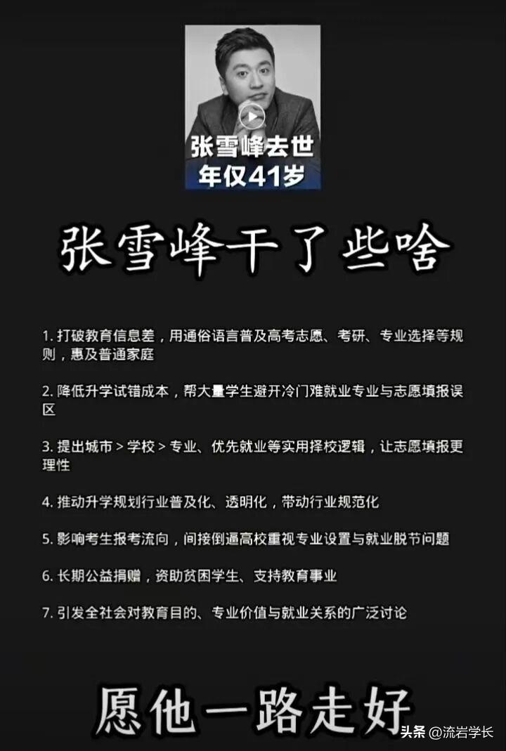 张雪峰干了些啥?你知道吗? 从寒门走来,为万千学子点灯 你用最实在的话,照亮寒门子弟的升学路。 同为教育践行者,深知寒门行路难。 谢谢你,为无数普通家庭撕开一道希望的光,指引着寒门子弟的未来 人间高考扔依旧,世上再无张雪峰,一路走好[祈祷][祈祷][祈祷]