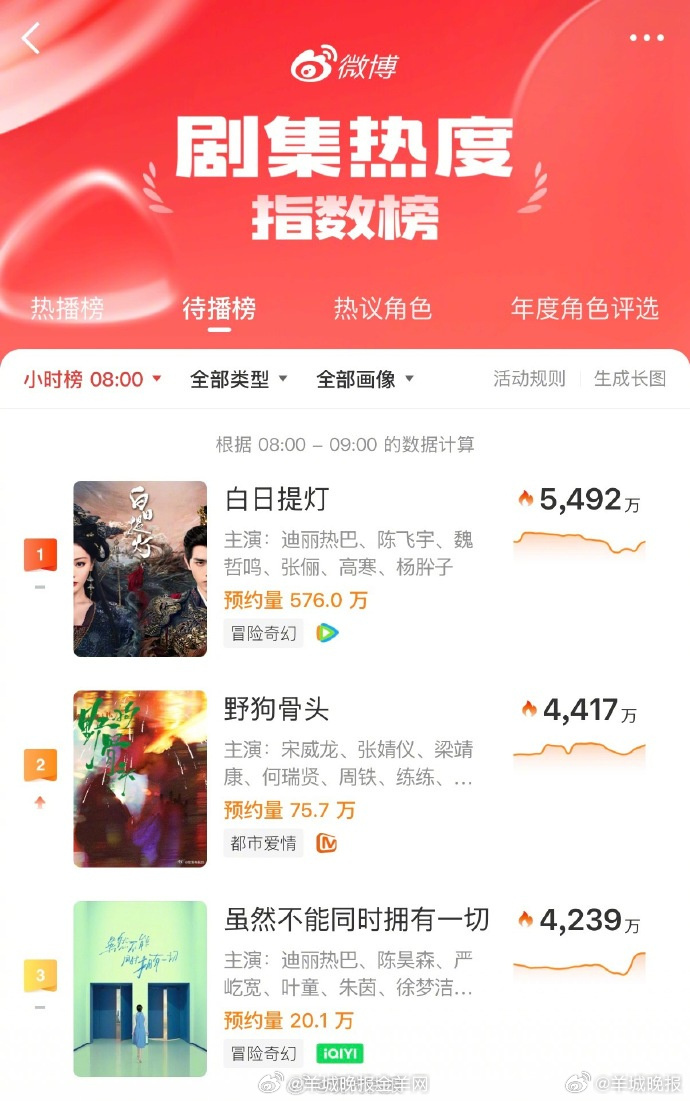【#迪丽热巴两部剧进待播榜前三#】#迪丽热巴两部待播剧热度领跑周杰伦新歌从夯到拉排名##颜如晶一年减重2.9斤##周杰伦 歌词##郝蕾说不想再见纪凌尘了#白日提灯OST官宣##浪姐7阵容#