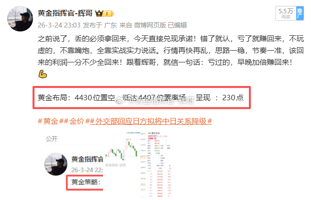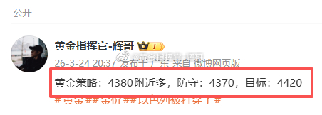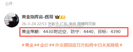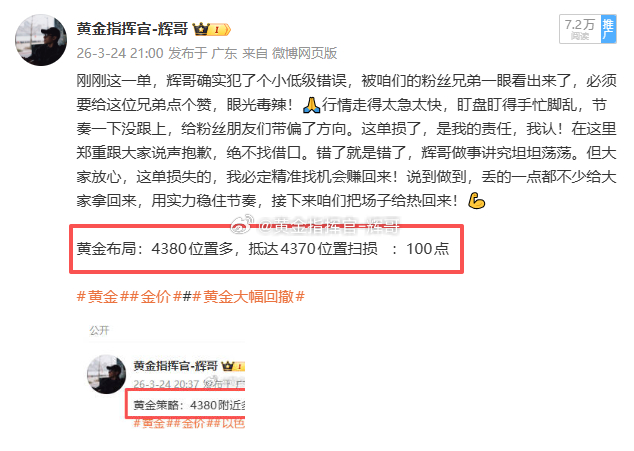 🎯【3.24周二总结】一共2张部署合计:130点!4380 多 → 4370 扫损 100 点4430 空 → 4407 230 点周二两单布局,一胜一负,整体拿下 130 点。有遗憾,也有收获,交易本就有起有落,不可能每单都完美。错的单子及时止损,对的单子坚定拿住,不贪不躁,稳扎稳打。哪怕只有小赚,也是正向收益,总比盲目扛单、越亏越多强得多。辉哥始终带着大家稳着做,不追求一夜暴富,只讲究长期稳健盈利。一天得失不算什么,保持思路清晰,咱们继续把收益稳稳拿住!