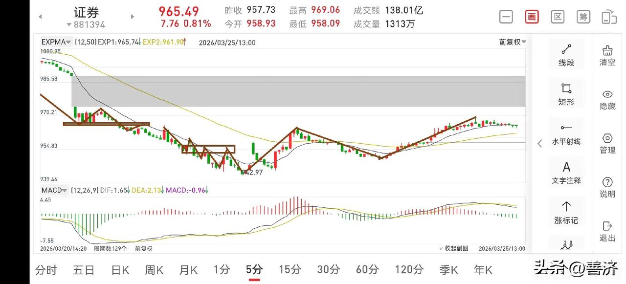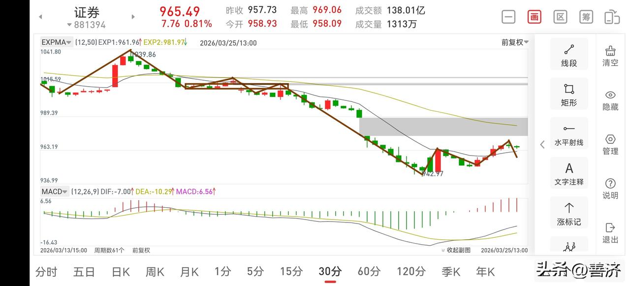 聊聊证券板块(2026.3.25) 今天证券板块如预期一样,冲高,临近收盘略有回落,今天收阳线基本上是没有问题的,但短线已面临变盘窗口,也就是说这二天的阳线是安慰性质的,接下来更大的可能还会继续下探,这也是最后一次下探。 1.从30分钟图一上看,目前正在构建一个30分钟中枢,所以下午会有一个略微回调,但幅度应该不大,预计14:30后会再次冲高,这也是短线的最后一次冲高,不管它有没有回补上方缺口,在收盘之前都可考虑把三成仓位退出来。 2.从5分钟图二上看,上午的30分钟一笔反弹已经结束,下午会有一个5分钟中枢的构建,待形成盘整背驰后,有望继续上冲,当然这次上冲是减仓的节奏,不要过于留恋,下方还是有几个点的下探空间的。 3.目前商业航天妖龙走势正常,可继续考虑持股观察。