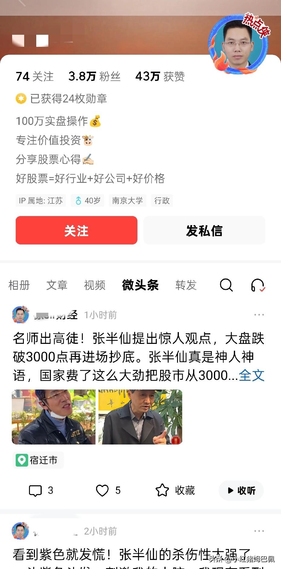 在某条,低质量的财经自媒体,往往都喜欢以“价值投资”标榜自己。一个近4万粉丝的号,号称价值投资,天天基本上都要写三四条张半仙,而其他真正涉及价值、涉及公司分析的内容,你打着灯笼也难找。 虽然不至于一棍子打死说号称价值投资的自媒体都如何如何,但据我观察,打着这个幌子骗人的比例依然是相当高的。一来这个旗号相对为人所知,比较容易帮助他们吸引粉丝和流量,二来要打其他复杂的旗号和深奥的内容,他们也打不出。