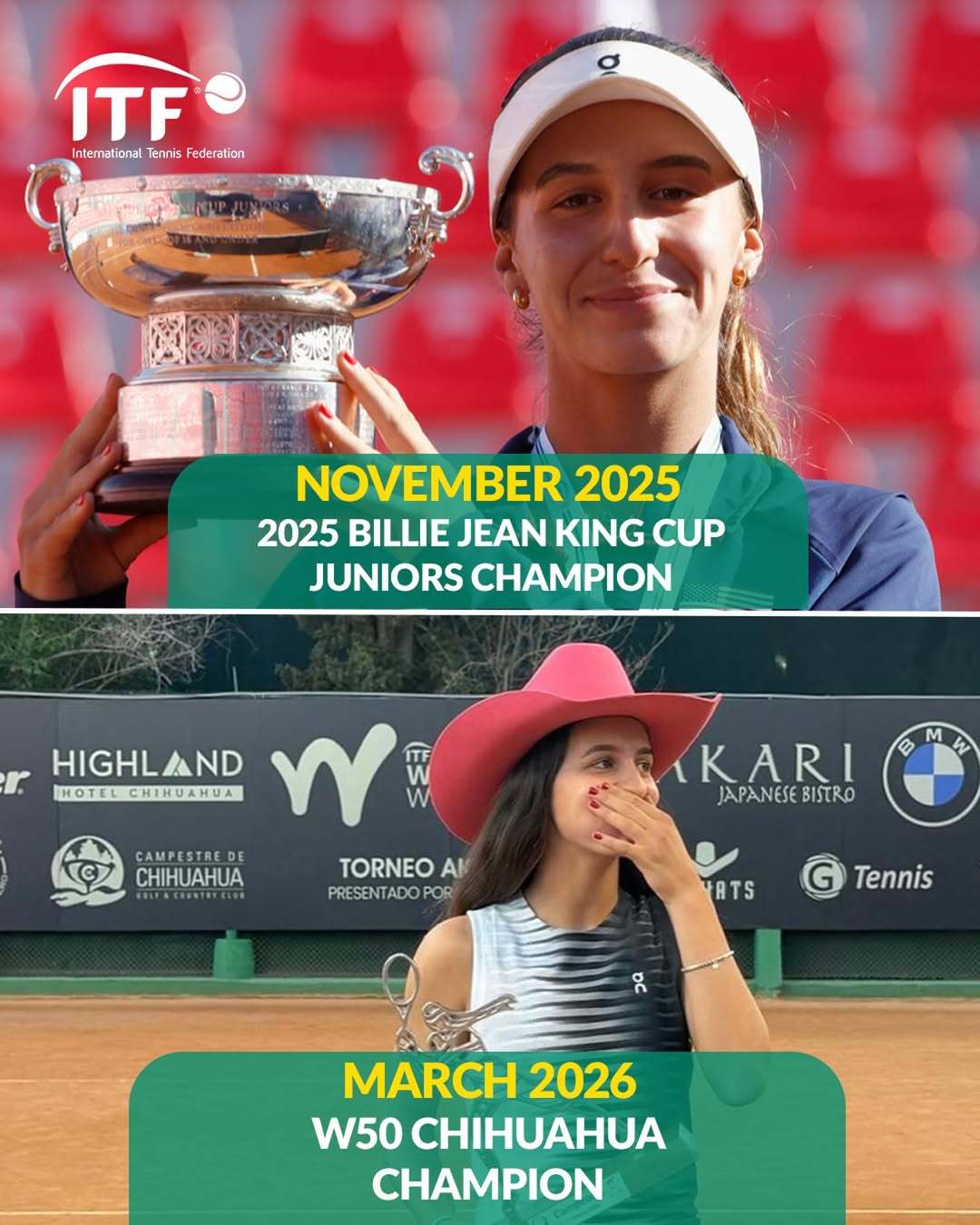 前青少年世界第一帕雷哈在去年11月赢得个人第二座比利·简·金杯青少年组冠军后,上周在奇瓦瓦W50中斩获职业生涯迄今最重要的一座冠军🐕