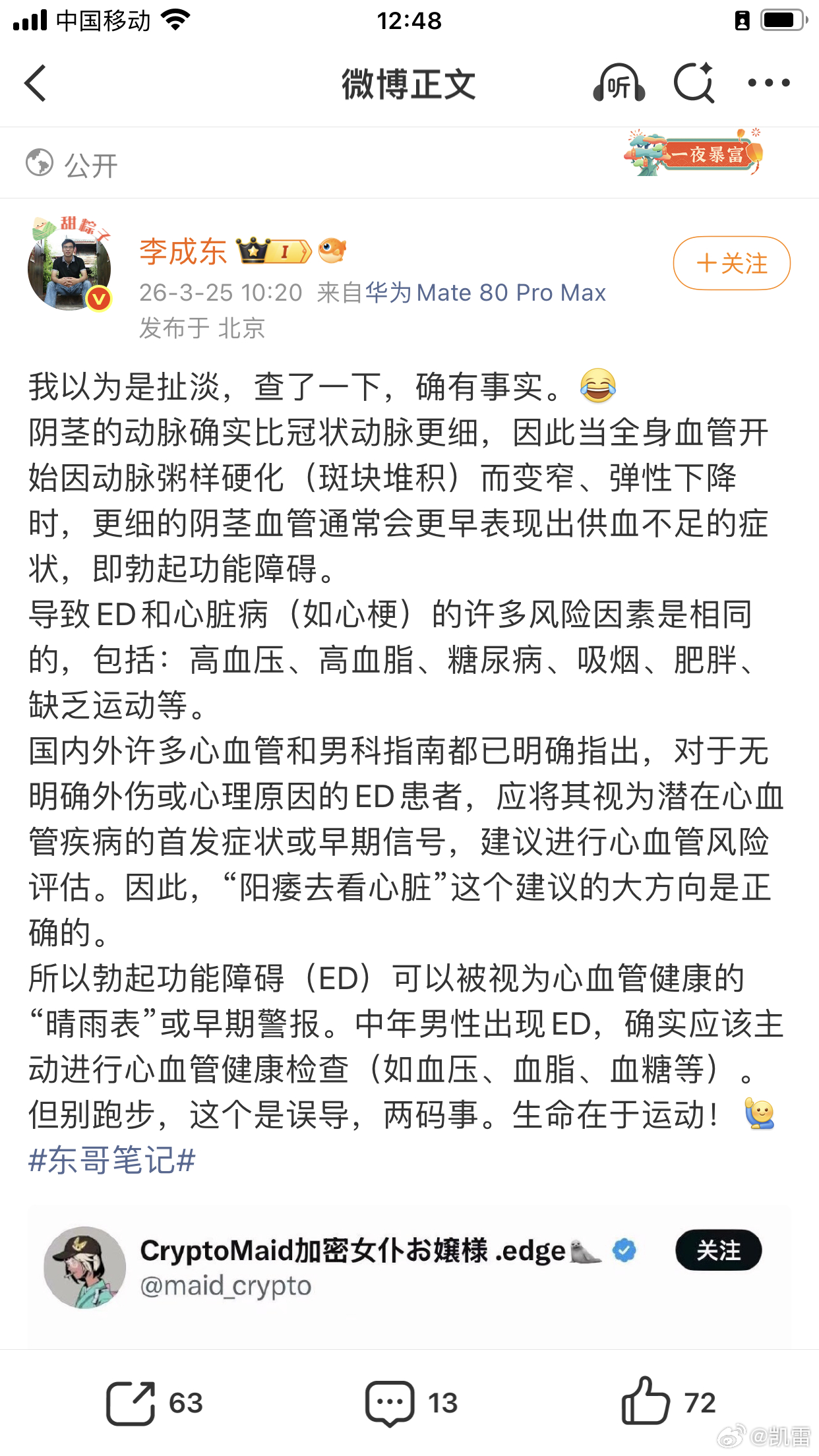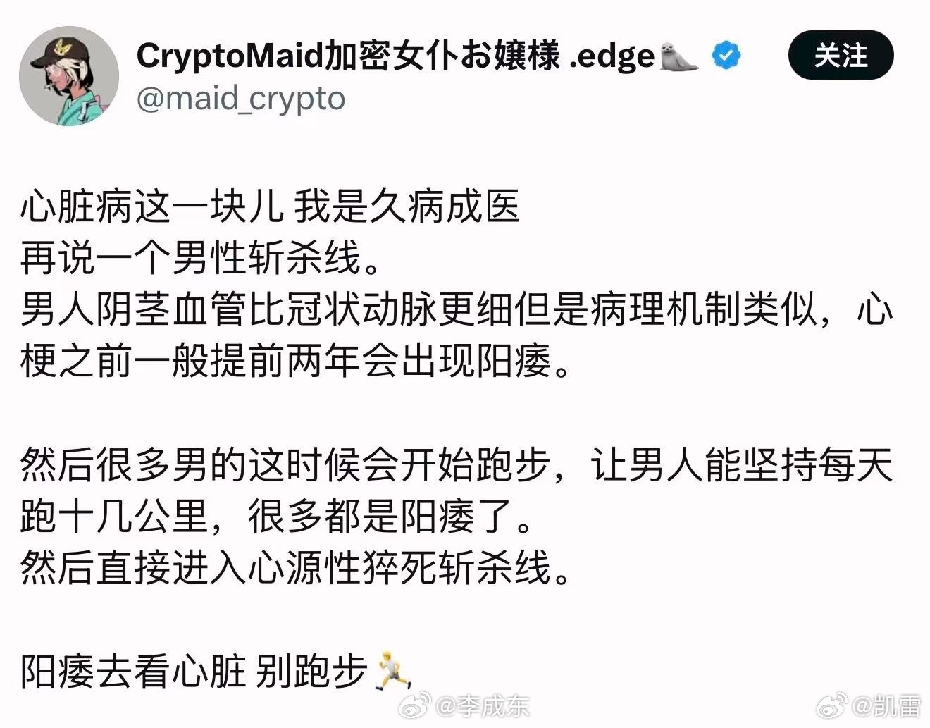 阳萎去看心脏别跑步 所以勃起功能障碍(ED)可以被视为心血管健康的“晴雨表”或早期警报cc