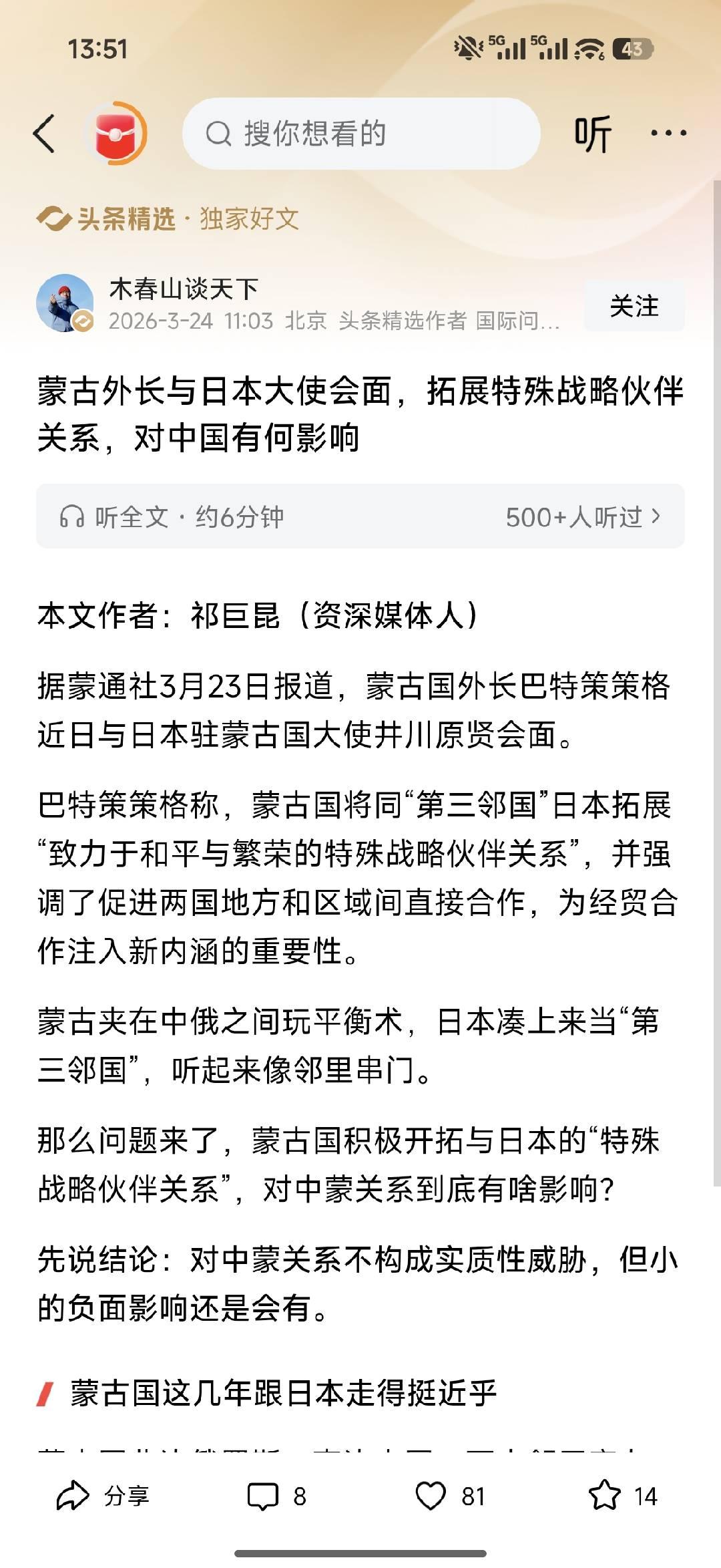 外蒙古与日本勾连拓展关系:看似玩平衡,实则难撼中蒙根基 外蒙古外长近期和日本大使会面,高调宣称要拓展所谓的“特殊战略伙伴关系”,说白了就是夹在中俄之间,又想抱日本的大腿,玩所谓的“第三邻国”平衡术,看似精明,实则根本翻不起什么浪花,更动摇不了中蒙关系的根基。很多人担心这会影响中国,其实大可不必,顶多就是蚊子叮一口,无关痛痒。 外蒙古心里打得算盘很清楚,北边是俄罗斯,南边是中国,两大邻居实力雄厚,它不想完全依附,就想找日本这样的“远房叔叔”拉关系,拿点援助、要些技术,好让自己站得“更稳”,不用事事看邻居脸色。而日本之所以热脸贴冷屁股,也没安好心,无非是看中了外蒙古的矿产资源,想挖点稀土、铜矿,缓解自己的资源焦虑,还想借着蒙古,在中俄之间插一脚,扩大自己的影响力,玩得倒是挺精。 说来说去,外蒙古和日本的勾连,就是各取所需的利益交换。外蒙古嘴上喊着拓展特殊关系,可心里门儿清,中国才是它最大的贸易伙伴和投资来源国,不管和日本走得多近,矿产终究要靠中国出口,基建、口岸也离不开中国支持。就算日本投钱、送装备,也改变不了这个现实。日本想靠拉拢蒙古离间中蒙关系,纯属白费心机;蒙古玩平衡术,也只是为了生存,根本不敢真的得罪中国。说到底,这事儿就是一场无关痛痒的闹剧,既影响不了中蒙关系的大局,也成不了日本制衡中国的筹码。