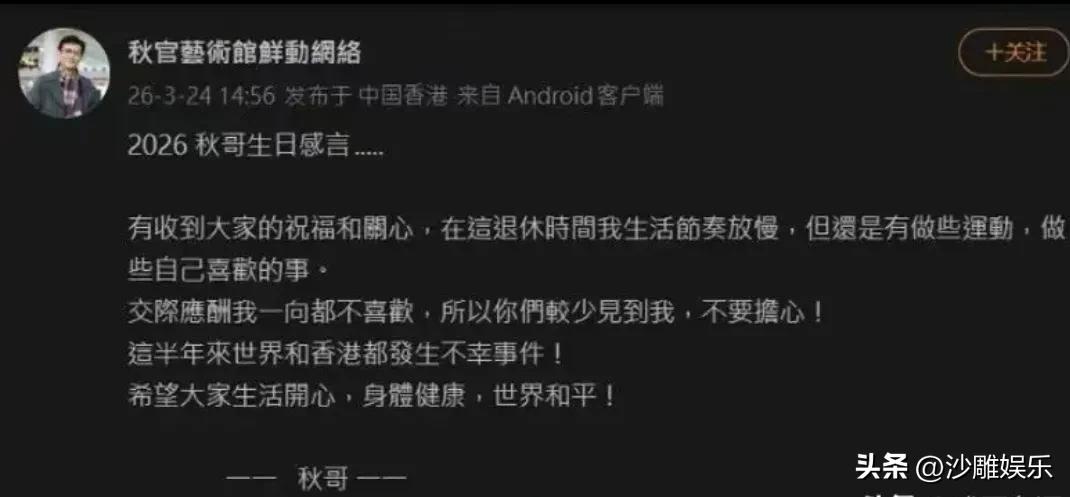 郑少秋,罕见发文回应! 3月24日,那个神隐了整整三年的“大侠”郑少秋,终于有消息了! 恰逢他79岁农历生日,一个名为“秋官艺术馆鲜动网络”的账号突然发布了一段署名“秋哥”的感言。这一下,直接炸出了无数潜水多年的老粉——要知道,自从2023年大女儿郑安仪离世后,这位曾经的“楚留香”就好像从人间蒸发了一样,连老搭档汪明荃都直言联系不上他 。 在这段迟来的生日感言里,秋官的语气出乎意料的平和。他坦言,自己其实已经进入了退休时间:“在这退休时间我生活节奏放慢,但还是有做些运动,做些自己喜欢的事。” 对于大家这几年的牵挂和猜测,他也给出了最直接的回应:“交际应酬我一向都不喜欢,所以你们较少见到我,不要担心! ” 字里行间,没有卖惨,也没有刻意煽情,只有一种历经风浪后的通透。他还提到了这半年来世界和香港发生的不幸事件,最后送上了最朴素的祝福:希望大家生活开心,身体健康,世界和平 。 时间拨回到2023年,秋官与卢慧茹所生的大女儿郑安仪在美国骤然离世,这成了他人生里一道难以抚平的伤口。由于种种原因,他甚至未能亲自送女儿最后一程,这打击让他久久难以释怀 。 此后的三年里,他彻底淡出公众视野。网上甚至一度流传他暴瘦、走路需人搀扶的旧视频,看得粉丝们心惊肉跳 。如今看来,那段视频其实是多年前的旧画面,老爷子这次亲自出来报平安,也算是给所有关心他的人吃了一颗定心丸——大侠虽老,但风骨犹存,他只是把时间留给了运动和自己真正喜欢的事,用平静的日常慢慢疗愈内心的伤痛 。 说实话,看到郑少秋这段回应,我心里那块悬了三年的大石头也终于落地了。 回顾秋官这一生,戏里他演尽了风流倜傥的侠客,戏外却尝遍了人情冷暖与至亲离别的苦楚。从当年和沈殿霞的恩恩怨怨,到如今白发人送黑发人,他身上的话题和争议从未断过。 但这次,他选择了一种最体面的方式回归大众视野。没有借机复出捞金,也没有消费逝者博同情,只是淡淡地说一句:“我很好,只是喜欢安静。” 这或许就是79岁的郑少秋,和这个世界和解的方式。我们总以为来日方长,却忘了世事无常。既然他选择在慢时光里抚平伤痕,作为看客的我们,最好的尊重就是不去打扰,只在远方默默祝福。 正如他所说,这半年世界发生了太多不幸,愿我们都能在纷扰的尘世中,找到属于自己的那份安宁。 最后,还是想补一句:秋官,生日快乐!愿你身体硬朗,哪怕江湖不见,只要知道你安好,便是晴天。
