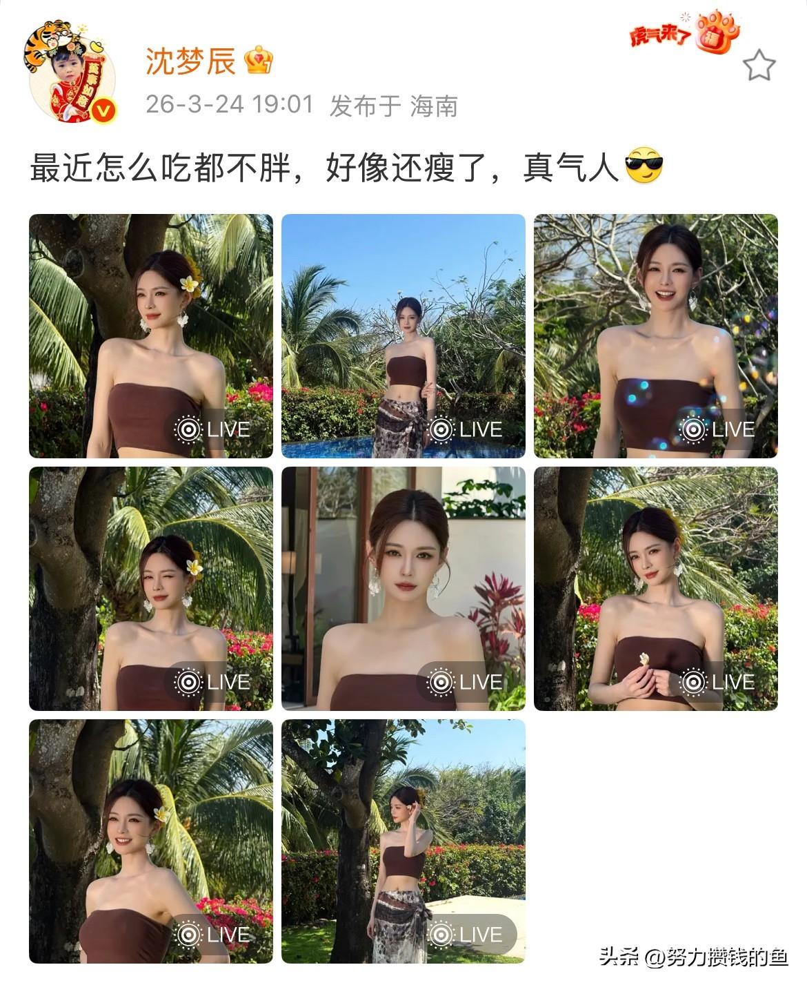 沈梦辰,太漂亮了 3月24日,沈梦辰在社交平台分享了一组照片,不是和杜海涛秀恩爱,而是她自己的单人度假照; 照片中,她化着精致的妆容,穿着抹胸长裙,整个人又瘦又高又漂亮; 沈梦辰给这组照片配文案,说: 最近怎么吃都不胖,好像还瘦了,真气人[酷] 哈哈,这不是让人羡慕嘛 网友们看到后,纷纷留言: 啧啧,你气,我们听着更气 这种身材要求多少斤啊 越来越美,身材超好