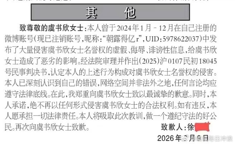 虞书欣维权成功,被虞书欣告的登报致歉了。