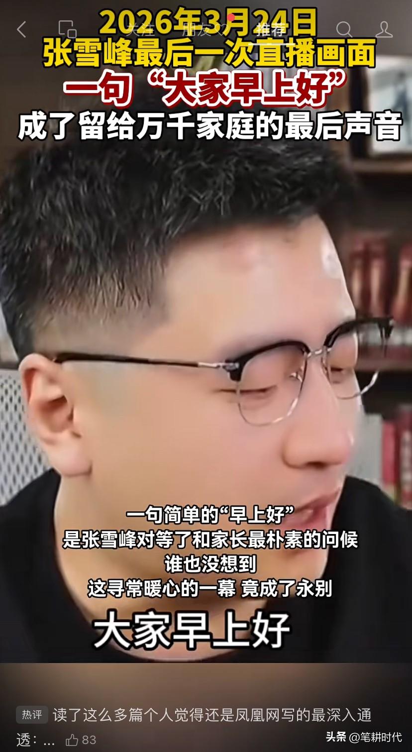 张雪峰去世前,最后一个视频,他一边吃饭一边聊报考,一桌子外卖,不过好歹都是家乡菜。老婆被指严重失职,认为张雪峰拼命赚钱,身体状况如何,当妻子的不应该为之操持负责吗? 说实话,就张雪峰的性格,别人的劝告未必能听。他的脾气,估计提醒也不中用。 就像网友说他嘴唇黑,注意心脏问题啊,他直接回怼说他跑半马的,每天八公里跑步,还怼网友说跑不过他。 看吃饭的这个视频,眉头紧锁,脸色也不好,而且不修边幅,整个人的精神状态感觉很疲惫。 他自己得年轻,没当回事,按照他的条件,身边人一定要建议他雇用营养师厨师,每日三餐,健康饮食,也会强好多啊! 加班熬夜,有点空闲时间不去睡觉休息,还去高强度运动,饮食习惯还不好,他是一样不占。 我从没有为一个熟悉的陌生人的离去感到如此悲难过。 他为普通家庭的孩子提供升学规划、指引方向, 他走了,那些家有高考生的妈妈瞬间失去了升学规划的“靠山”。 农村的孩子,把他当成了唯一能指望的人,当成了升学路上唯一的 “信息拐杖”。 虽是给排水专业出身,却靠帮室友查资料死磕成升学专家,说话直戳痛点却满是对寒门学子的真心。 一个划时代的拼搏者,这样离去真让人无法接受啊!