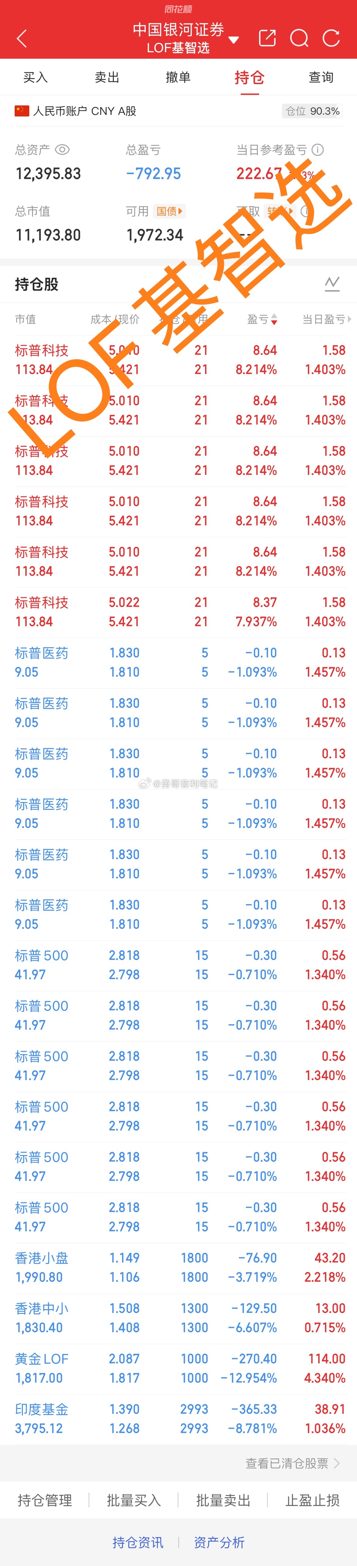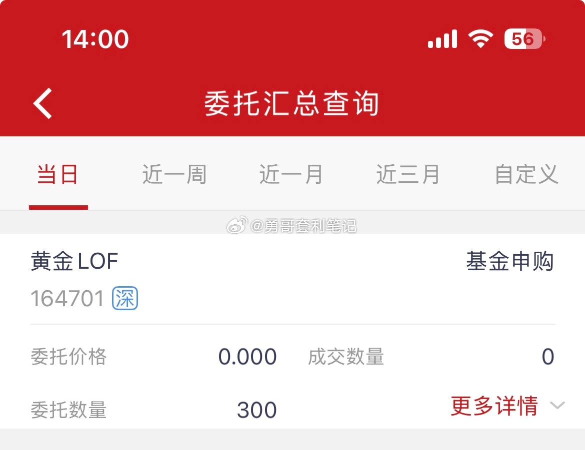 基金套利 黄金lof164701溢价率3%,限额50*6。仅供参考,抄作业有风险,套利需谨慎,所有申购盘中跳水,溢价率抹平或大幅缩小将撤单!实盘贴图仅作为个人记录之用,不构成任何投资建议及操作指引!盈亏自负,切勿盲目跟风!