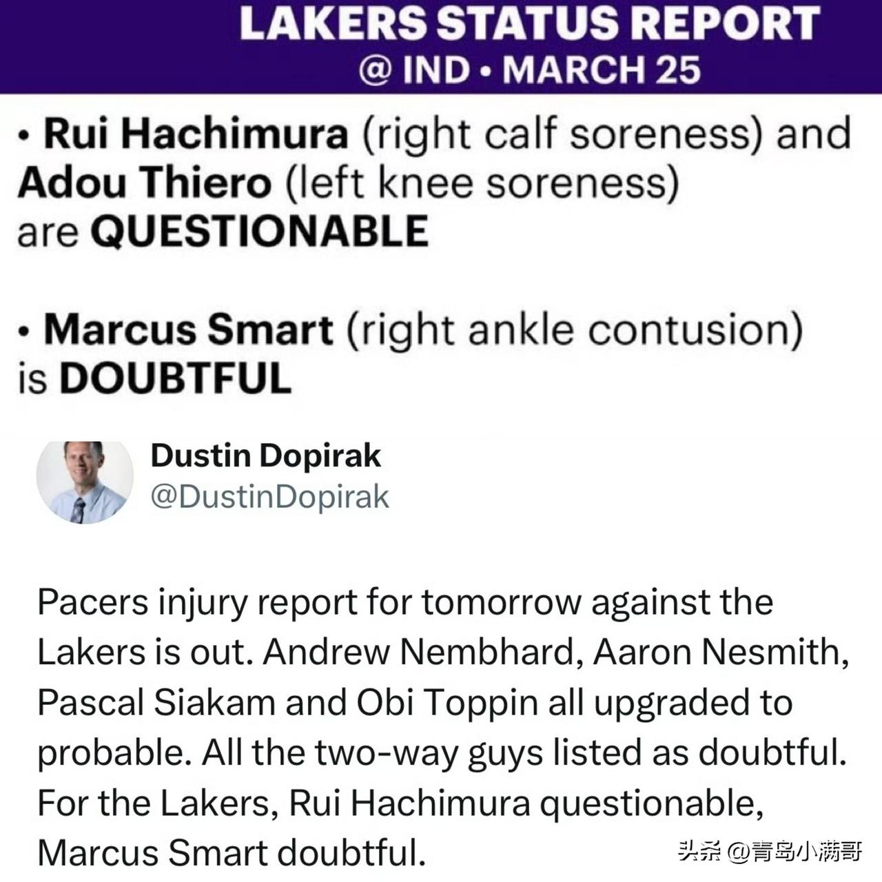 六连客最后一战!!!湖人vs步行者比赛预告,湖人被看好! 北京时间3月26号上午七点,湖人做客印第安纳,挑战步行者队,这是他们他们六连客的最后一战,上一场输给活塞后,湖人的没能完成十连胜,这也让湖人球员很是不开心,明天的步行者可能会成为湖人的炮灰,他们势必要重整旗鼓,给步行者一次沉重的打击,好好的释放下自己的压力。 步行者目前排在东部倒数第一,他们无欲无求,只希望不要成为倒数第二,不怕输球,而湖人排在西部第三,双方的差距是显而易见的,一起来看下明天的比赛预告和比赛预测吧! 湖人队伤病情况: 八村垒右小腿酸痛、蒂耶罗左膝酸痛,他们的状态都是出战成疑;而刚哥斯玛特遭遇右脚踝挫伤,状态是不太可能出战。 步行者队伤病情况: 内姆哈德、内史密斯、西亚卡姆、托平,他们四人状态是大概率出战;双向合同球员状态都是出战成疑;祖巴茨肋骨骨折已经赛季报销,无法出战。 目前,从ESPN给出的结果预测来看,湖人以超过七成的胜率被非常看好可以拿下本场比赛,相关机构给湖人客场-11.5也说明了双方的差距不是一点半点的。 两队上次交锋是在26年的3月7日,湖人主场128-117大胜步行者,所以湖人无论是从阵容上、实力上,还是历史交手情况来看,他们都是更强的一方,常规赛最后还剩下10场比赛,算上步行者一共四个客场,难度不大,继续加油吧。湖人 东契奇 詹姆斯 步行者 nba 步行者