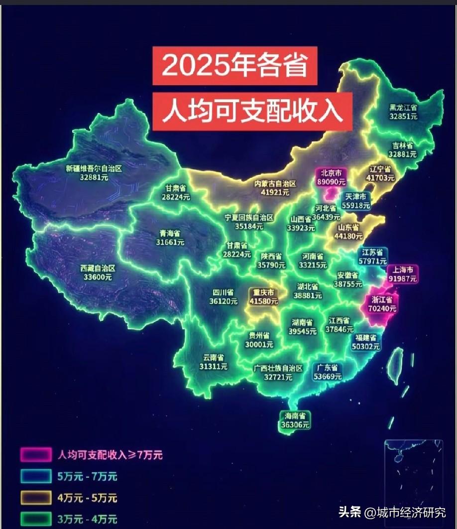 各省人均可支配收入数据,广东省江苏省人均可支配收入都为5万多元人民币,广东江苏人均可支配收入水平挺接近的,重庆人均可支配收入要比四川人均可支配收入更高一些,而湖南省属于中部人均可支配收入最高的省份,从图片整体数据来看东部区域的省份人均可支配收入要更高一些,中西部省份还需要继续努力加油。