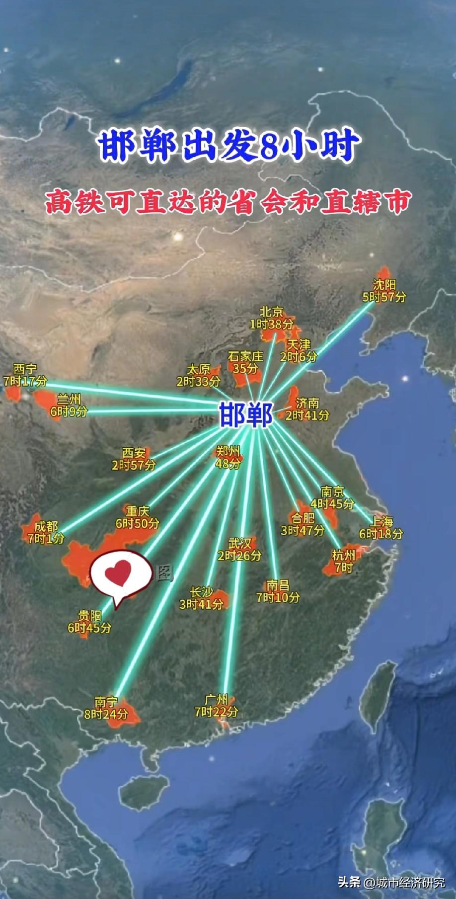 邯郸市坐高铁8小时可直达的省会城市和直辖城市名单情况,图片里属于邯郸市坐高铁8小时可直达的省会城市和直辖城市名单,邯郸市坐高铁到北京仅需要一个多小时就可以达到,到天津也仅需要两个小时左右,可见邯郸到北京天津还是比较方便的,从图片能够看出邯郸市坐高铁8小时现在能够直达许多的省会城市以及直辖城市,可见邯郸市现在的高铁网络建设的还是非常不错的。