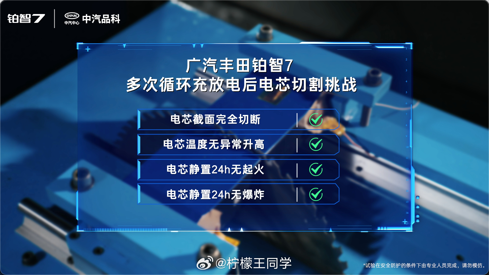 【丰田铂智7电池扛住切泡冲撞极限测试】中汽中心对丰田铂智7进行了极端测试,从各个极限场景给电池包来了一波大考,看得出来丰田确实是把安全放到了第一位