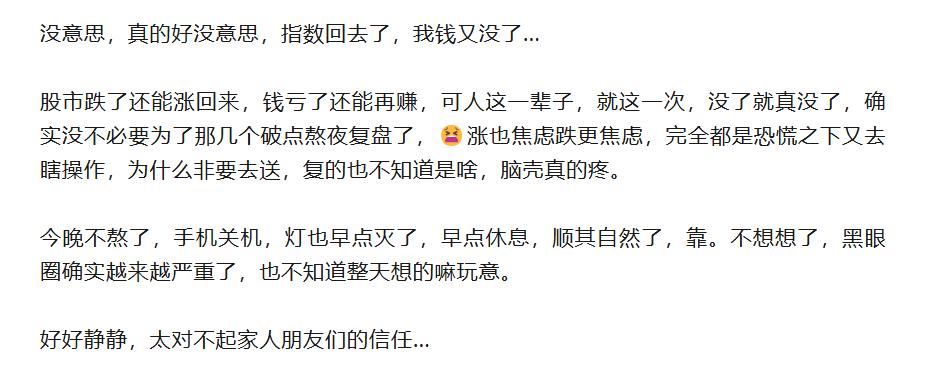 大曾子明天又要跌破30万了,充值7万不到一个星期就亏完,下午电力龙头豫能跳水,大曾子买了个后排中军,金开都被带到水下了,最终收红,而大曾子追高梭哈人场,目前还亏一个点。如果晚上辽能被关小黑屋,后排跟风小弟肯定是第一个跌停,大曾子明天肯定又是绿的。他还天天熬夜复盘,不知道再复些什么,龙头一次都没买过,每次都是板块退潮了他才去接盘,前面的化工,现在的电力,还说自己选股能力很绝,真是服了。大曾子应该好好消息一下了,这么好的行情居然能亏钱