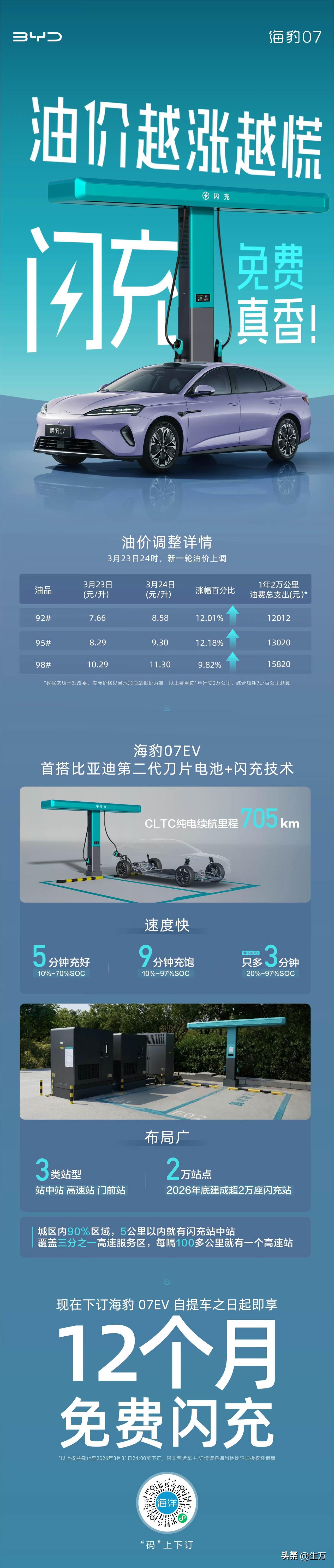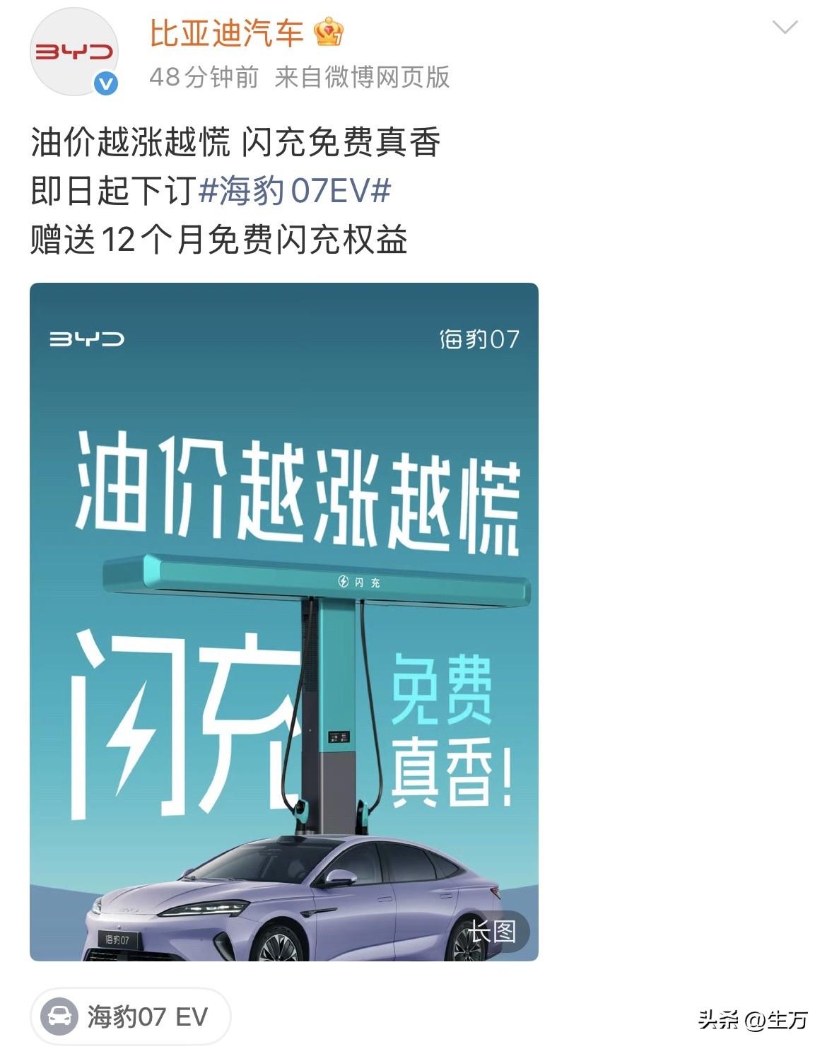 比亚迪:油价越涨越慌 闪充免费真香[捂脸] 就在刚才,比亚迪在官方社交账号发出了这篇小文章,这个文章比较有意思的就是前面12个字,但确实比亚迪说的也是事实,毕竟现在油价上涨,对于传统燃油车用户来说,这个时候,他们如果知道买比亚迪的相关系列车型送一年免费充电的权益,可能会认真考虑一下! 前两天孙少军也在社交网络上表示,因为油价上涨的原因,这几天去看新能源车的车主,明显要高于从前,说明大家平时都是过日子的人,尤其是在使用车上一定会计算使用成本,这个时候再来看新能源汽车和燃油车之间的区别,好像每个人就有了自己的答案。 尤其是这段时间,比亚迪弄了这个闪充技术之后,给旗下好多个独立品牌的用户都免了差不多一年的充电费用,关键是还可以根据不同级别车主的需求,个性化的建充电桩,比如最让大家羡慕的就是仰望车主,只要有一个车主提出建充电桩的申请,比亚迪现场考察之后,对于符合条件的,直接就可以跟他们建。 所以当心里面企业来真的,实实在在地投入的时候,这种竞争力可能就不仅仅只是在产品本身上面,而是在后续的便捷性以及服务性上面,如果某一天能够达到所有的新能源车主,在使用车的时候,真的比加油站更加的方便,而且也更加的便宜,那么可能会有更多的人加入这个行列。