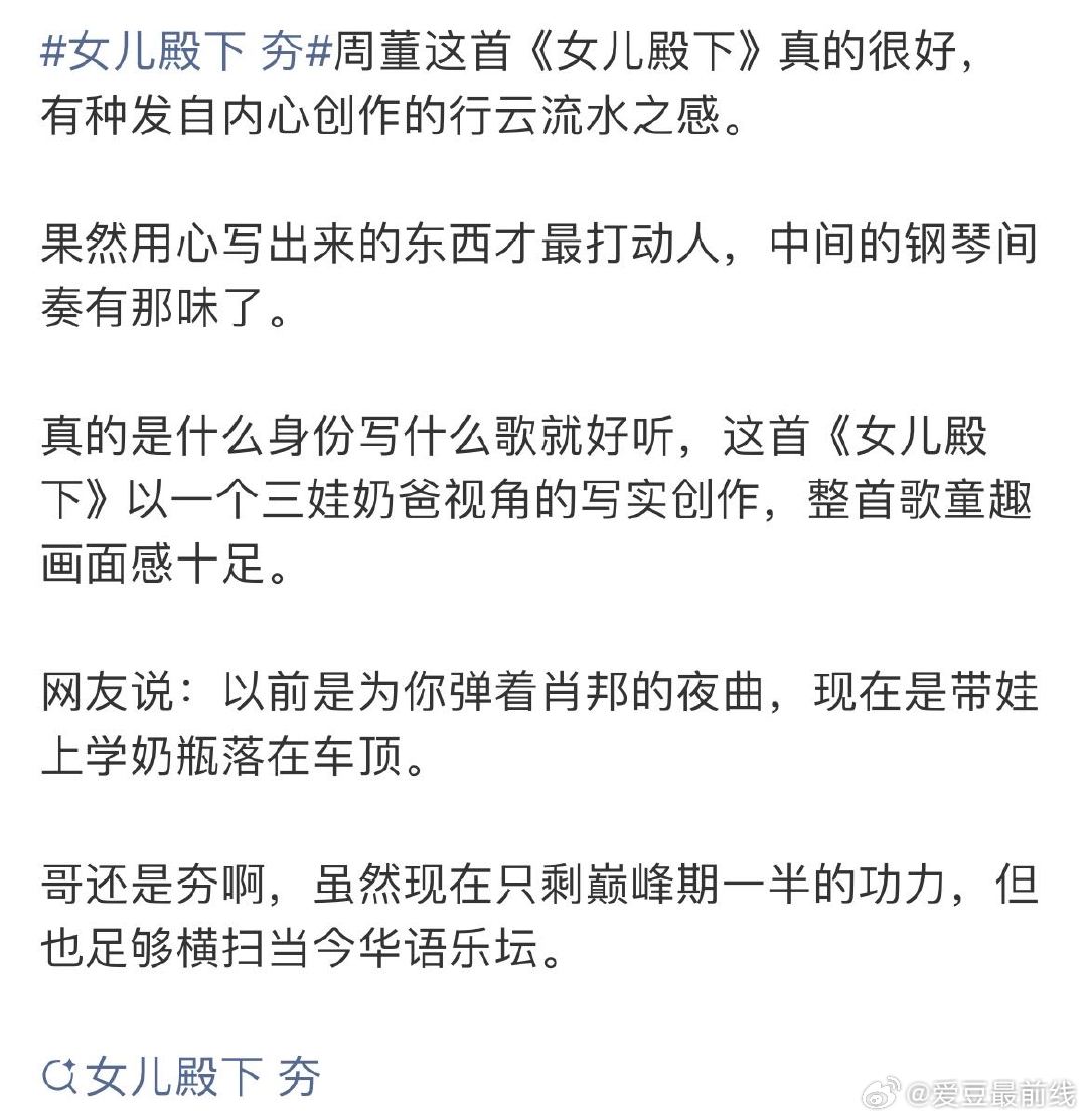 女儿殿下 夯 周杰伦新歌女儿殿下好萌 网友集体沦陷《女儿殿下》!有人说旋律轻快越听越上头,有人被带娃歌词戳中直呼太真实,还有人夸周董把父爱写得满是画面感,宠女之歌直接封神了!