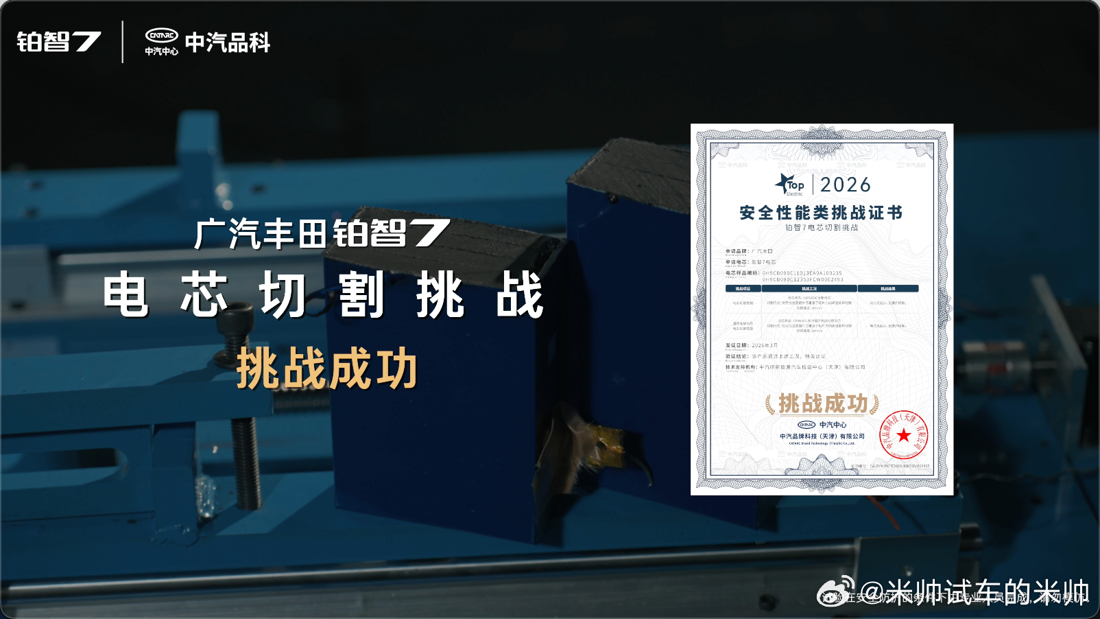 中汽中心最近针对丰田铂智7开展的一系列极端工况安全与耐久测试,其中最具说服力的电芯切割测试,模拟车辆严重碰撞导致电芯断裂的极端场景,无论是全新电芯,还是历经800次循环、等效30万公里的长里程电芯,切割全程温度无异常升高,静置24小时均不起火,从根源验证了电芯本征安全。让市场对其安全性能高度聚焦,也用直观实测打破用户对纯电安全的顾虑!